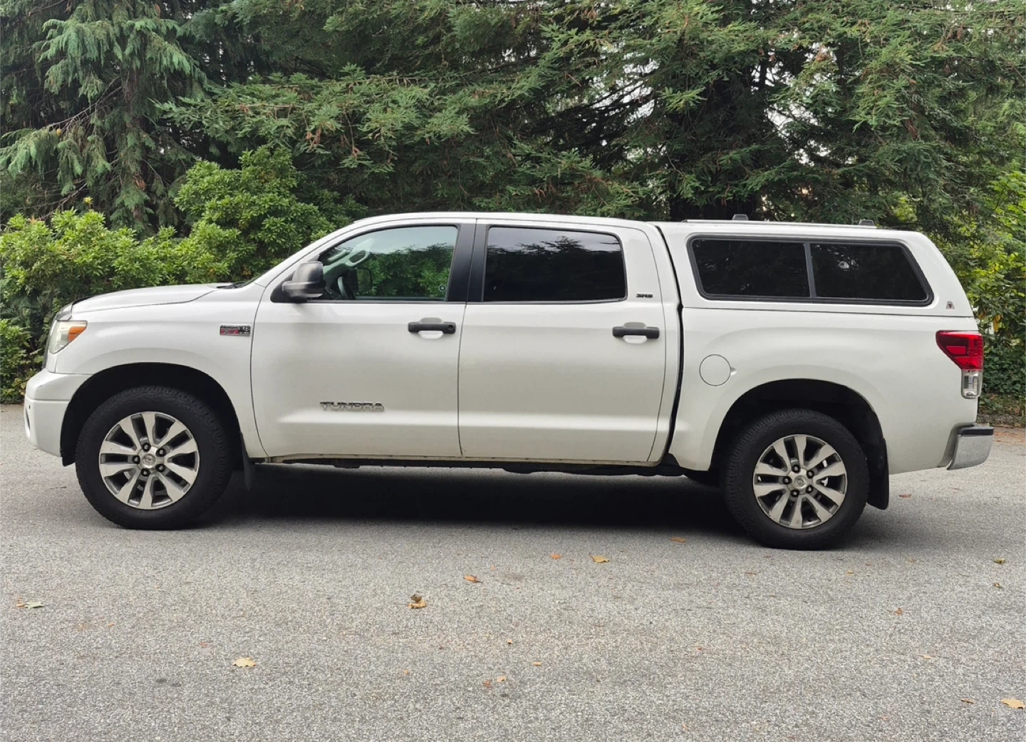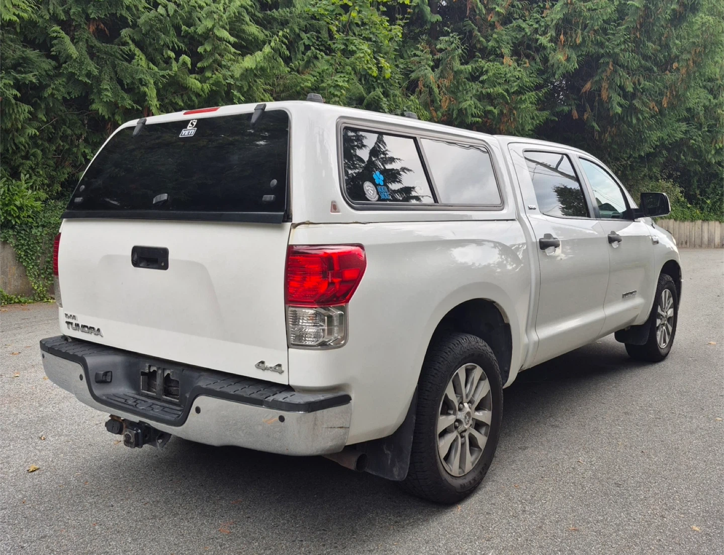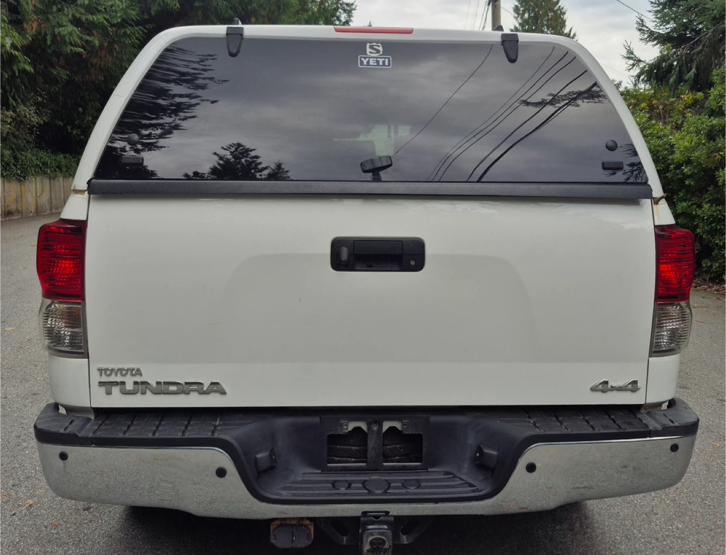 Selling a 2014 Toyota Tundra Crew Max. It's white and looks like a 4x4 model. It has a cap on the back. 382,000km. Replaced A/C compressor and safety inspected. Local BC truck, clean title. Drives and runs great.