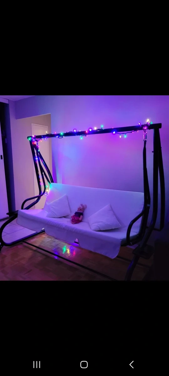 Selling a comfy outdoor patio swing bed. It's perfect for relaxing evenings with the built-in lights! The swing bed features a sturdy frame and a comfortable seating area with pillows. Great for enjoying the outdoors!