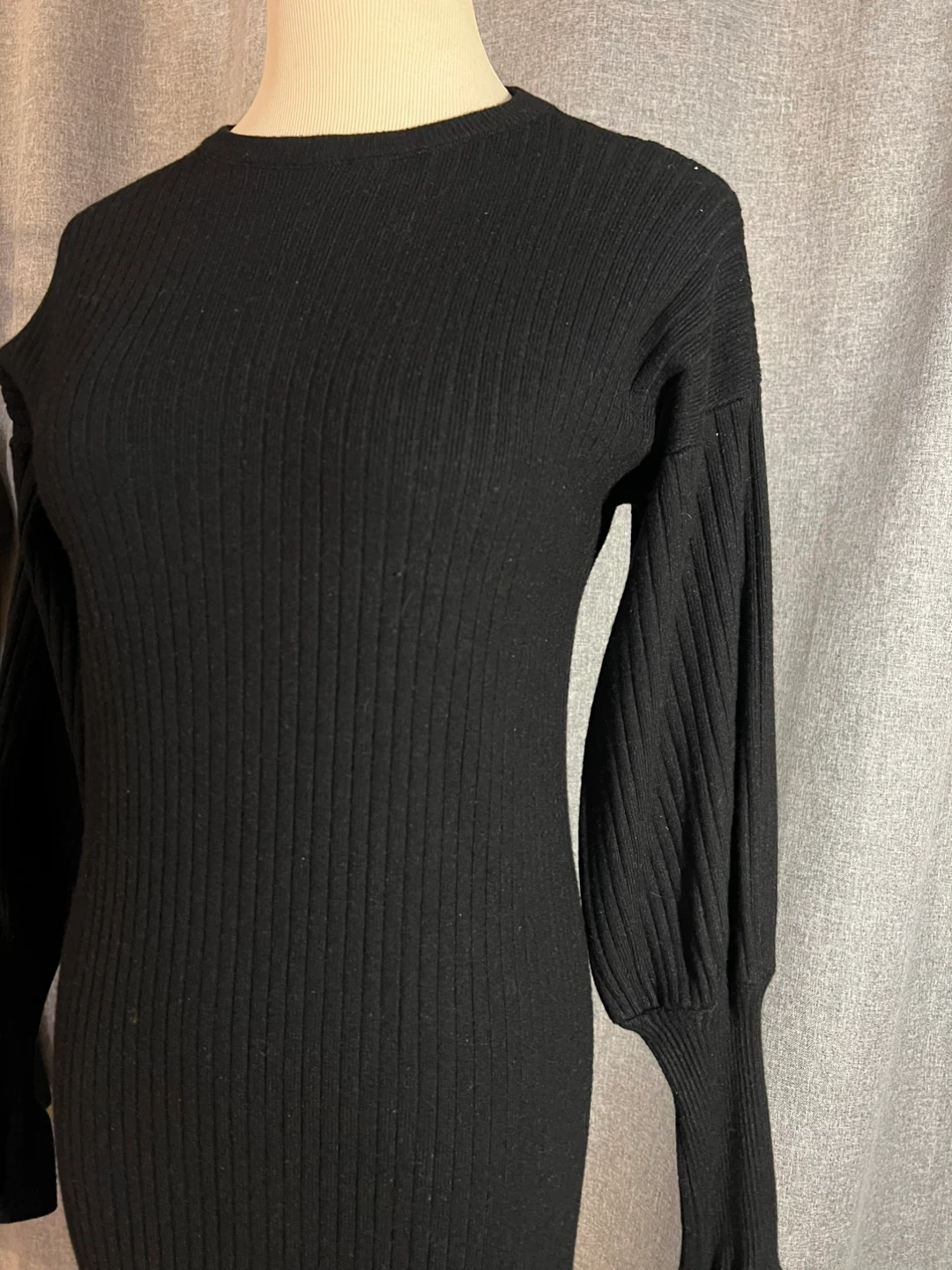 A lovely black knit midi dress! It has long sleeves and a flattering silhouette. Perfect for any occasion