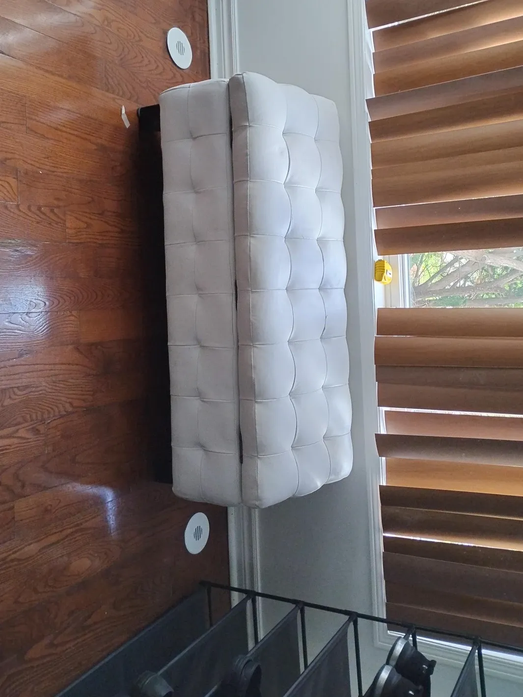 Selling a stylish white tufted ottoman bench! It's in great condition and would look lovely in any living space. The tufted design adds a touch of elegance and comfort