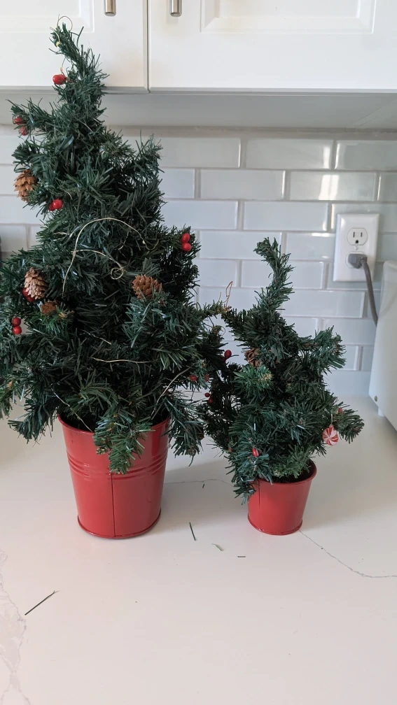 Selling a cute set of two potted Christmas trees! They come in red pots and are decorated with pinecones and red berries. Perfect for adding a festive touch to your home this holiday season