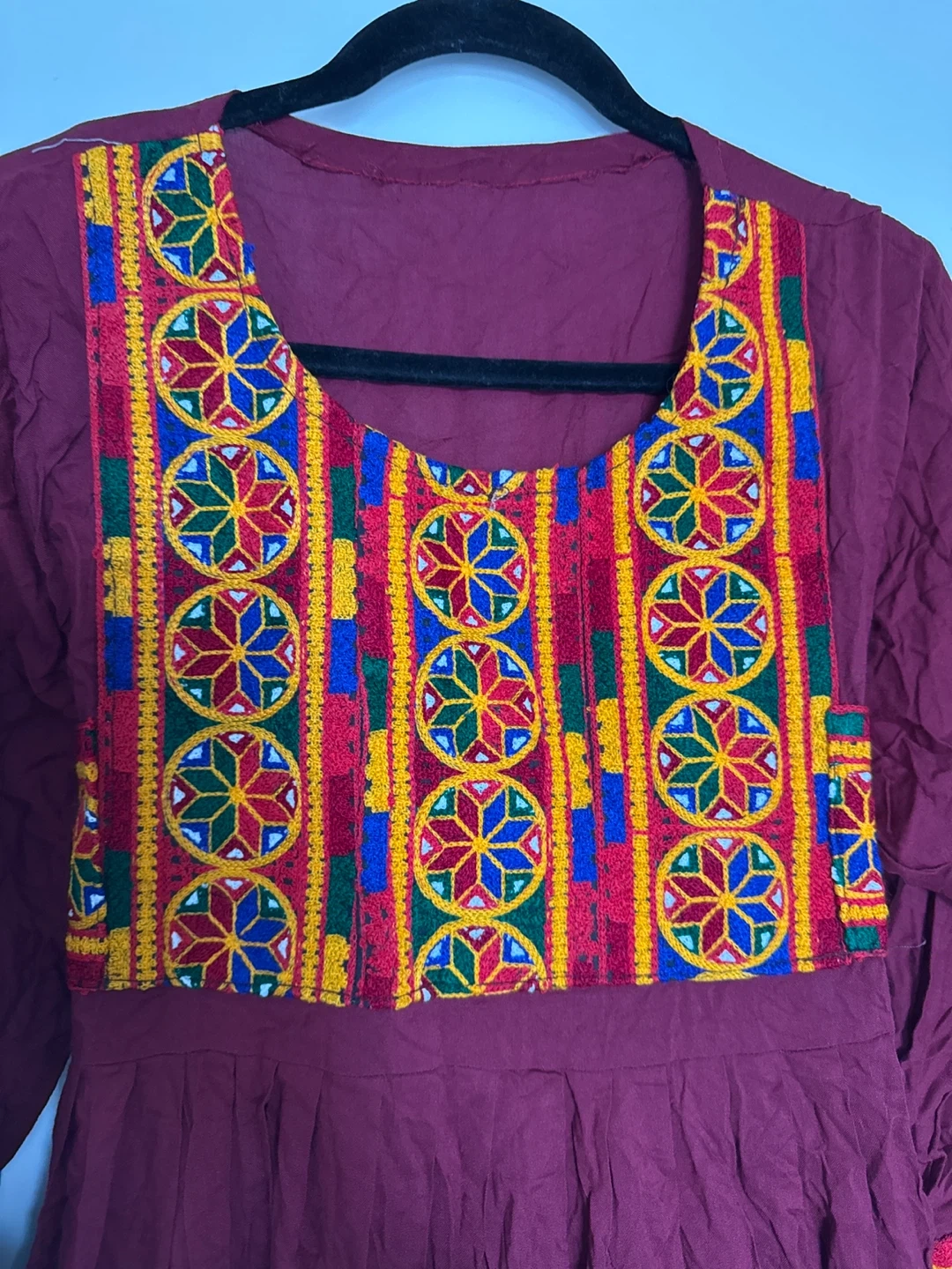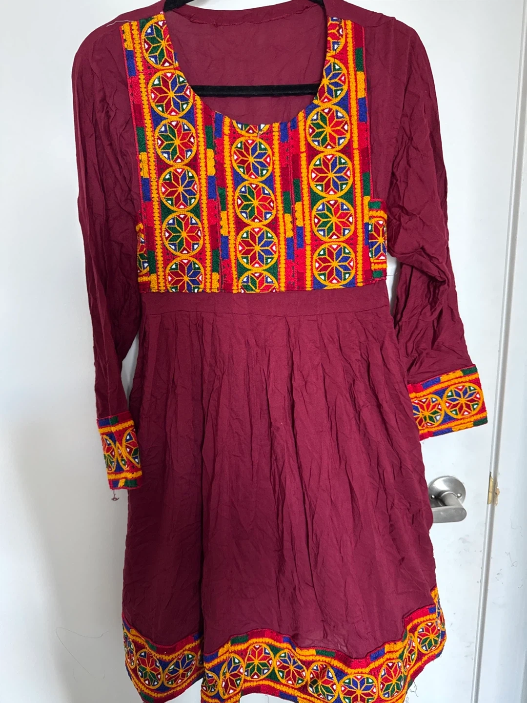 Selling a beautiful burgundy dress with colourful embroidery. It's in great condition and has a unique, eye-catching design. Perfect for adding a touch of cultural flair to your wardrobe!