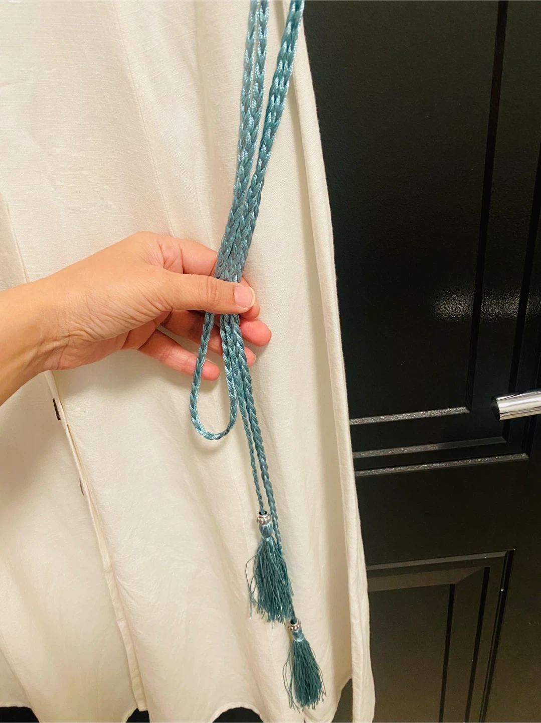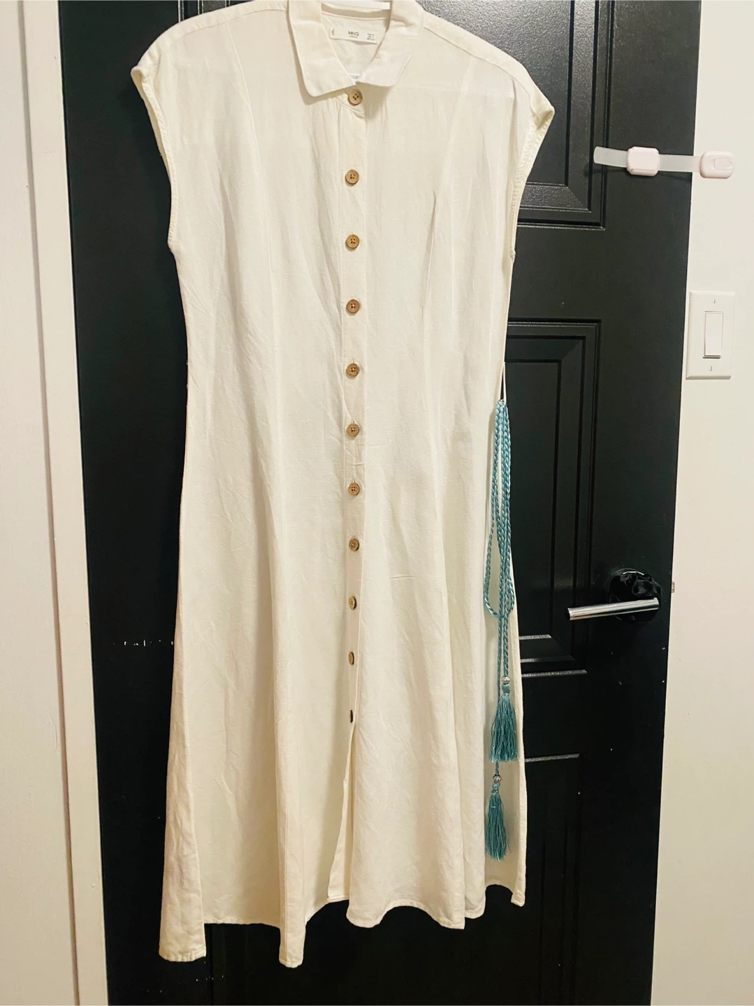 This is a Mango brand, casual style, midi dress in size XS. This dress features a button-down front and stylish side tie, blending comfort with a touch of elegance. making it a sustainable and fashionable choice.