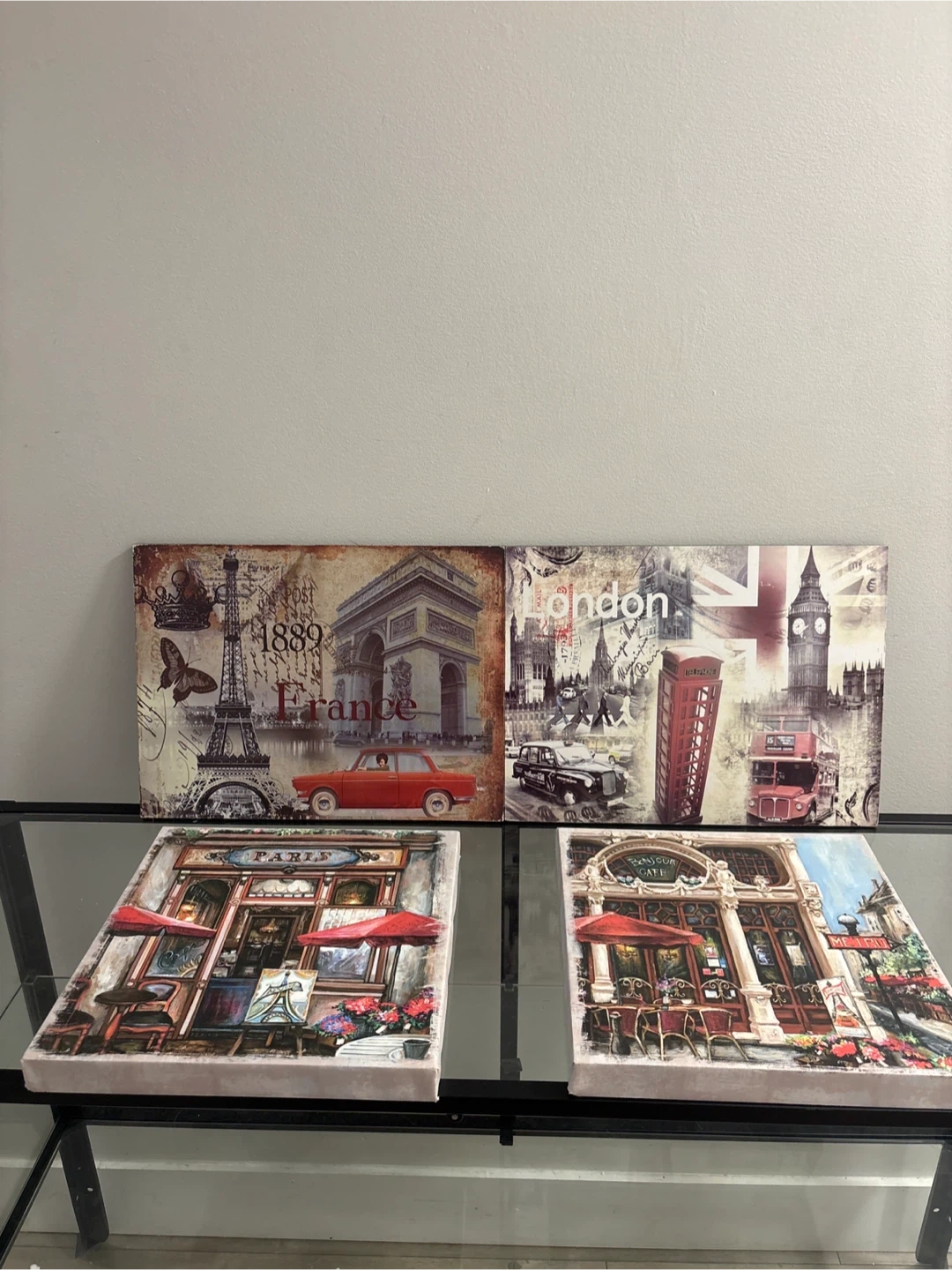 Selling these canvas prints. They feature scenes from Paris, London, and France. Perfect for adding a touch of European charm to your home decor