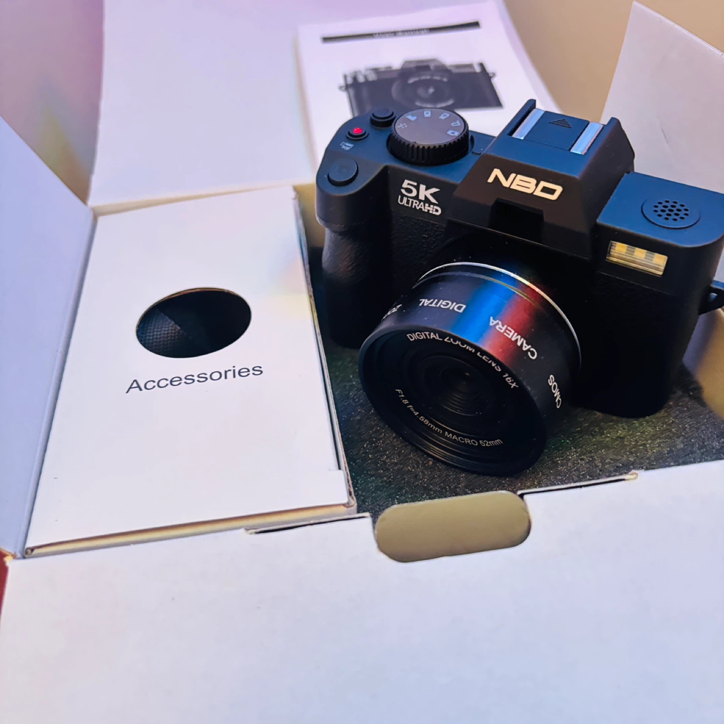 Selling a brand new NBD S100 digital camera! This camera shoots in 5K Ultra HD and has 64MP. It also has 16X digital zoom. Accessories and box are included! Has a really cool selfie / vlogging / vlog function.