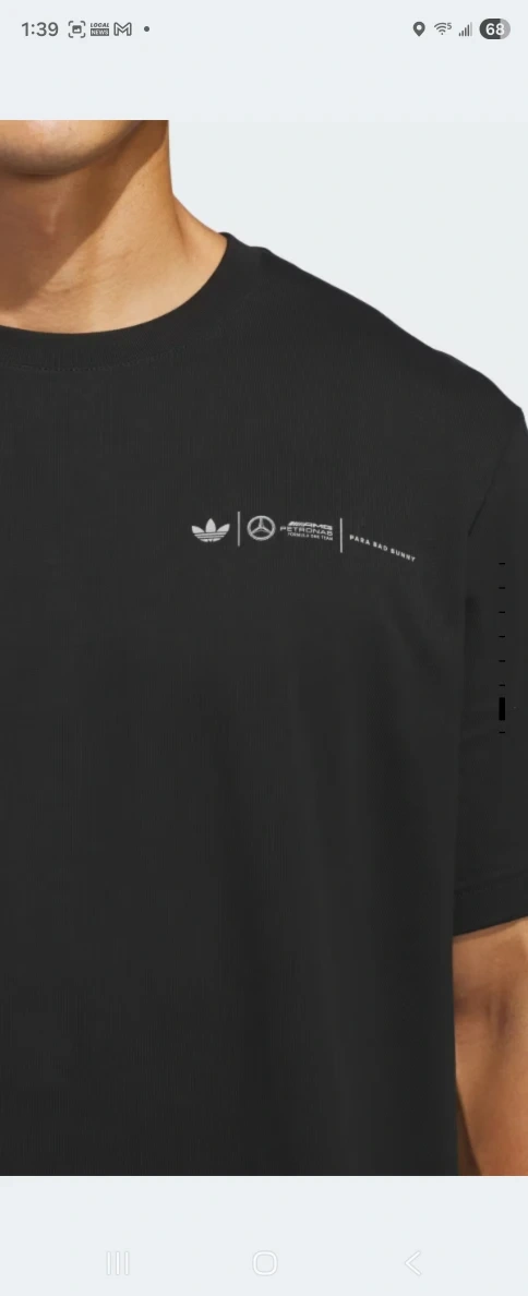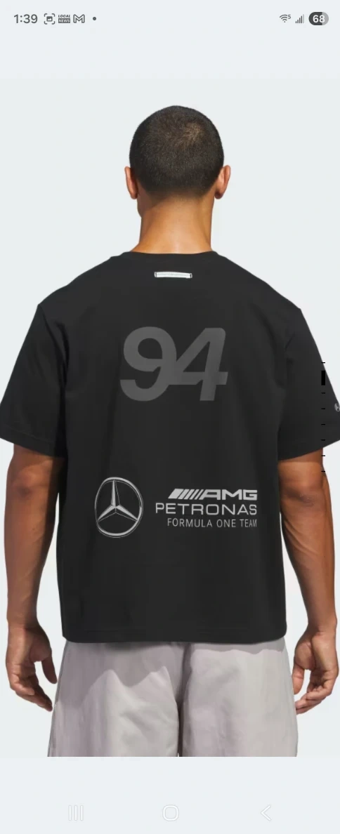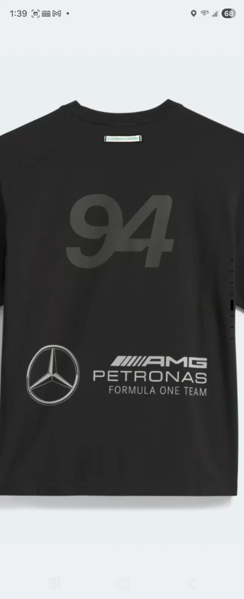 This is an Adidas Mercedes AMG Formula One Team t-shirt. It's black and features the Adidas logo, the Mercedes logo, and the AMG Petronas Formula One Team logo. It also has the number 94 on the back. Perfect for any Formula 1 fan! Will be shipped out to me on NOVEMBER 17 2025