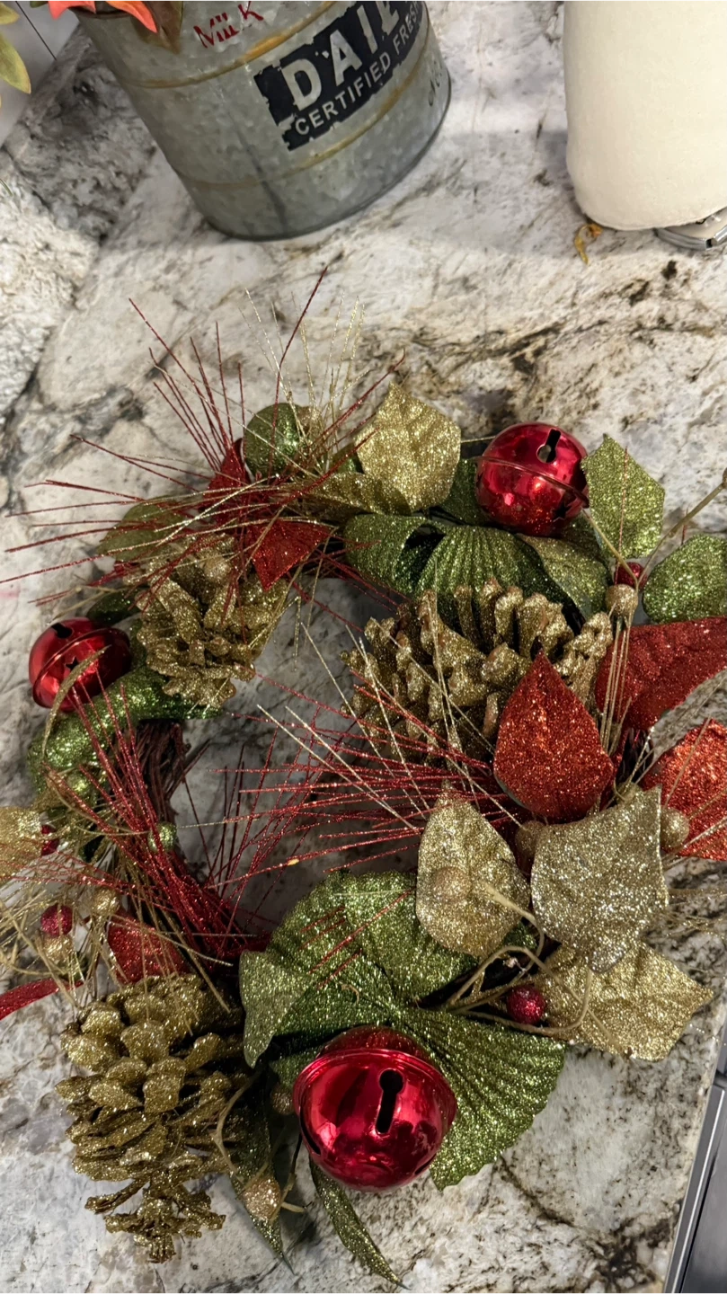 Add a festive touch to your home with this charming Christmas wreath! It features a mix of pinecones, glittery leaves in gold and green, and bright red bells. Perfect for hanging on your door or using as a centerpiece during the holidays