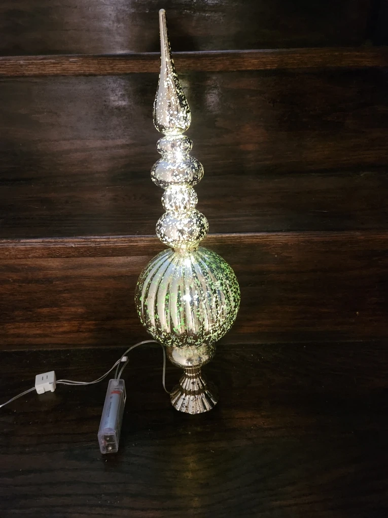 Selling a Christmas tree topper battery operated $15 and a Christmas ornament glass from Bombay$15 . They're in great condition and ready to add some sparkle to your holiday decorations