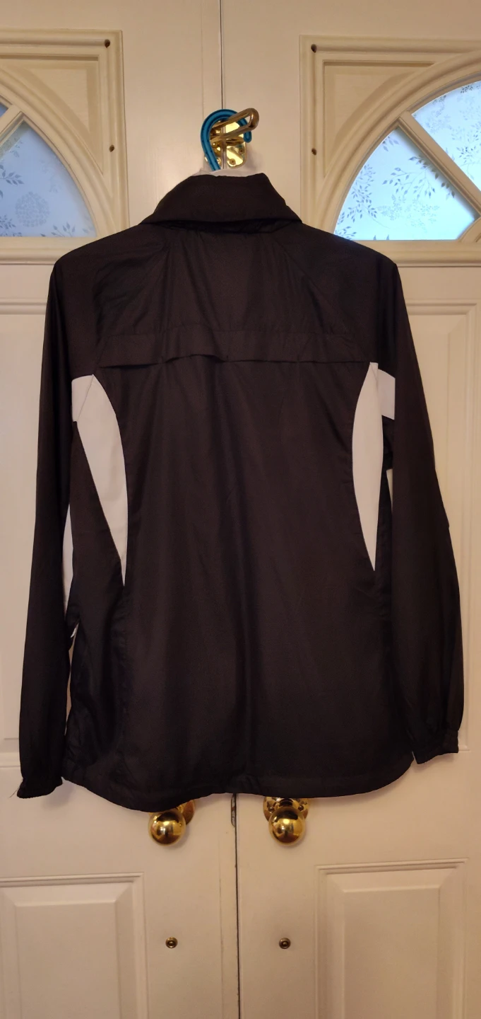 Here's a T22 windbreaker jacket up for grabs! It's black with white accents and in great condition. Perfect for those breezy days or workouts!