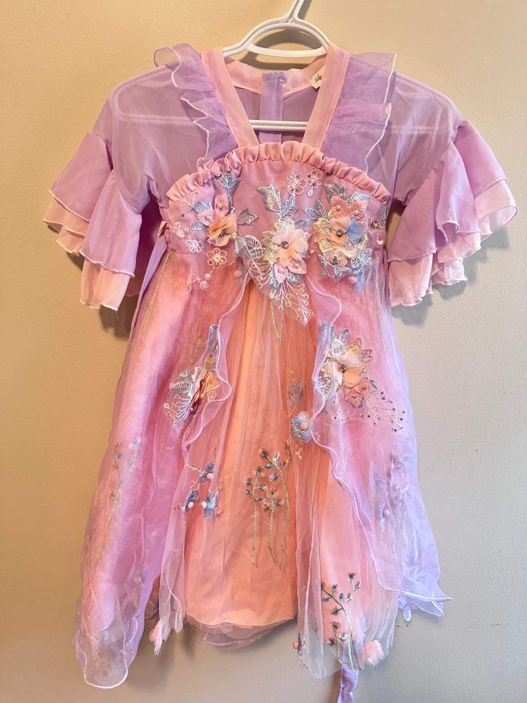 Selling a beautiful pink and purple dress with flower details! It's in great condition and perfect for a special occasion. The dress has a layered design with ruffles and a tie at the waist. The intricate floral embellishments add a lovely touch