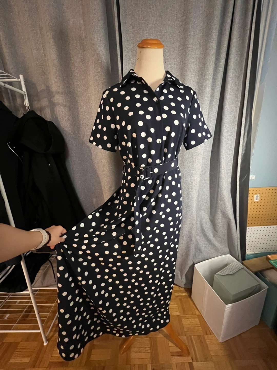 A cute polka dot maxi dress! It features a classic collar and a matching belt to cinch the waist. Perfect for a sunny day out or a casual gathering