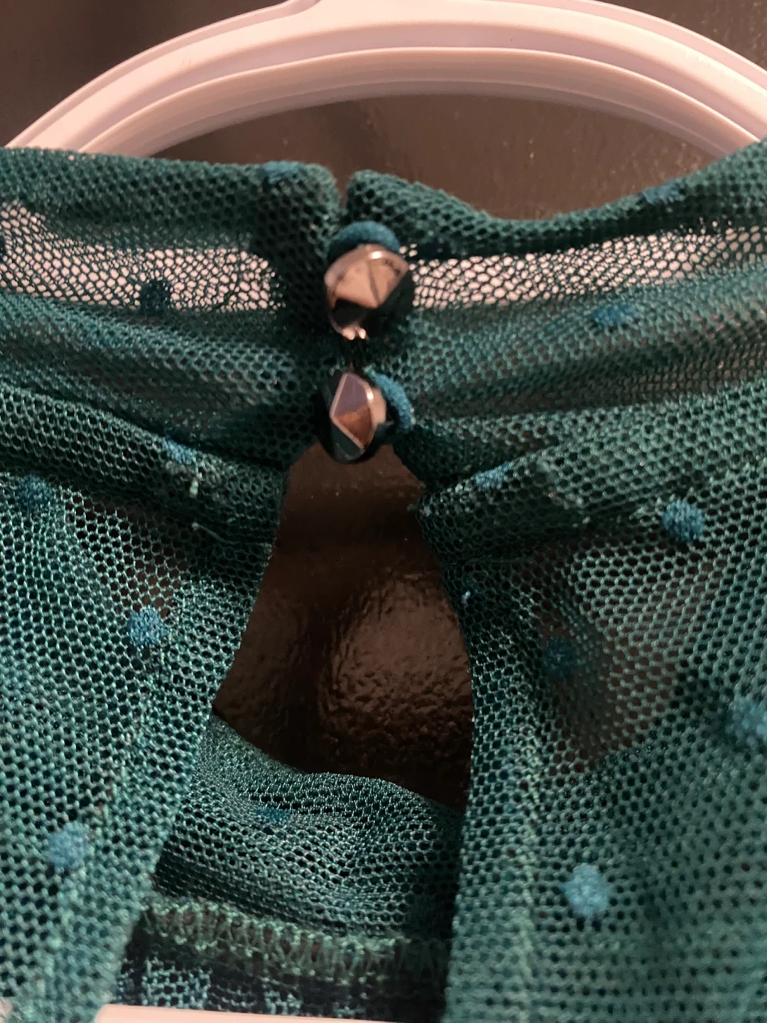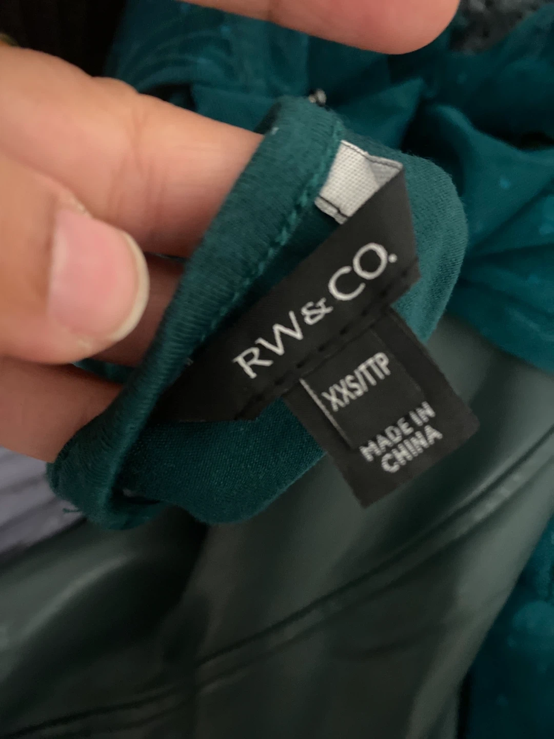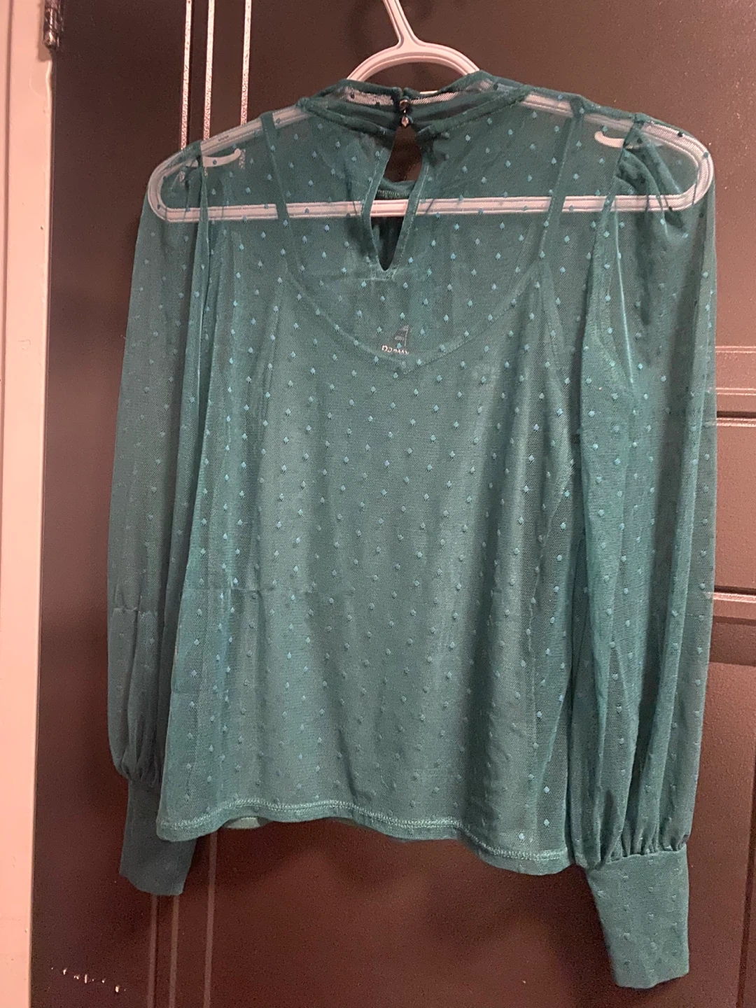 This pre-owned RW&Co blouse features a stylish mock neck and long sleeves, perfect for adding a touch of elegance to any outfit. The sheer fabric with subtle polka dots adds a unique flair. It is in good condition, ready to be worn and enjoyed.