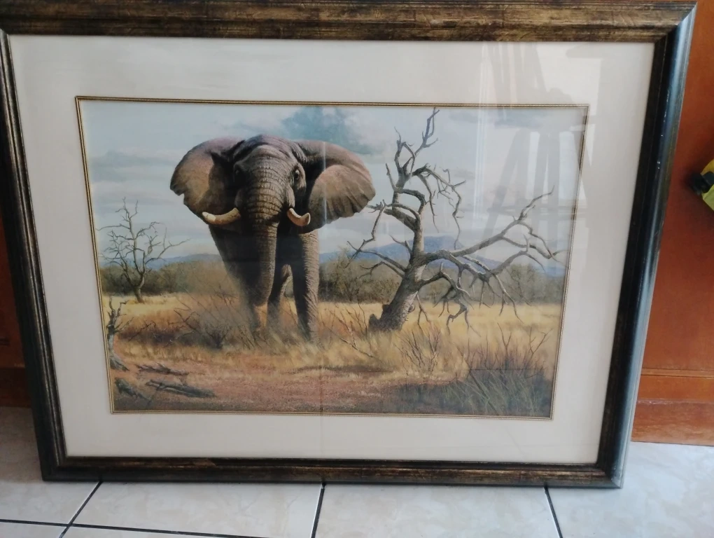 20Selling a framed print of an elephant in a natural setting. The frame is a dark brown with a gold trim. It would look great in any room.