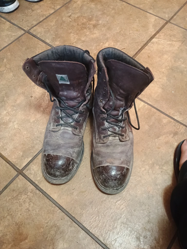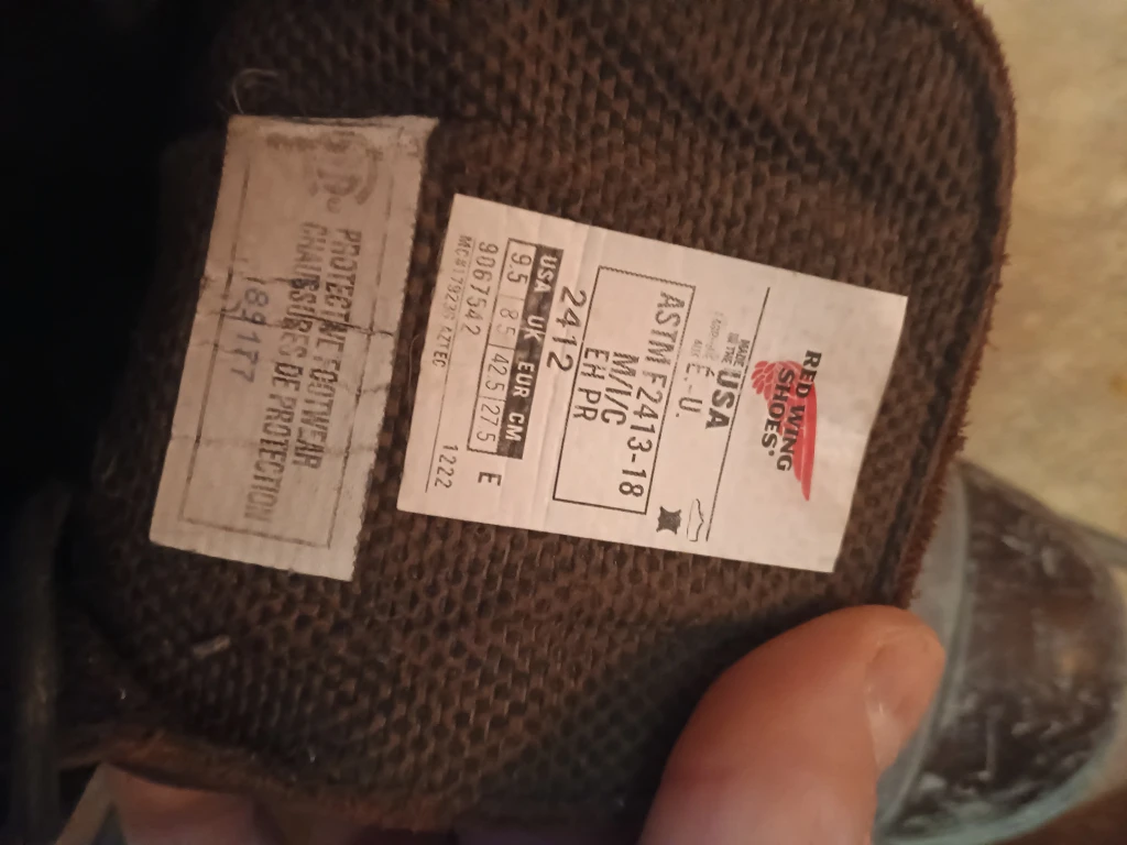 Selling a pair of Red Wing 2412 work boots in well-used condition. They are a US size 9.5, UK size 8.5, EUR size 42.5. These boots feature ASTM F2413-18 M/I/C EH PR safety standards, making them suitable for protective footwear.