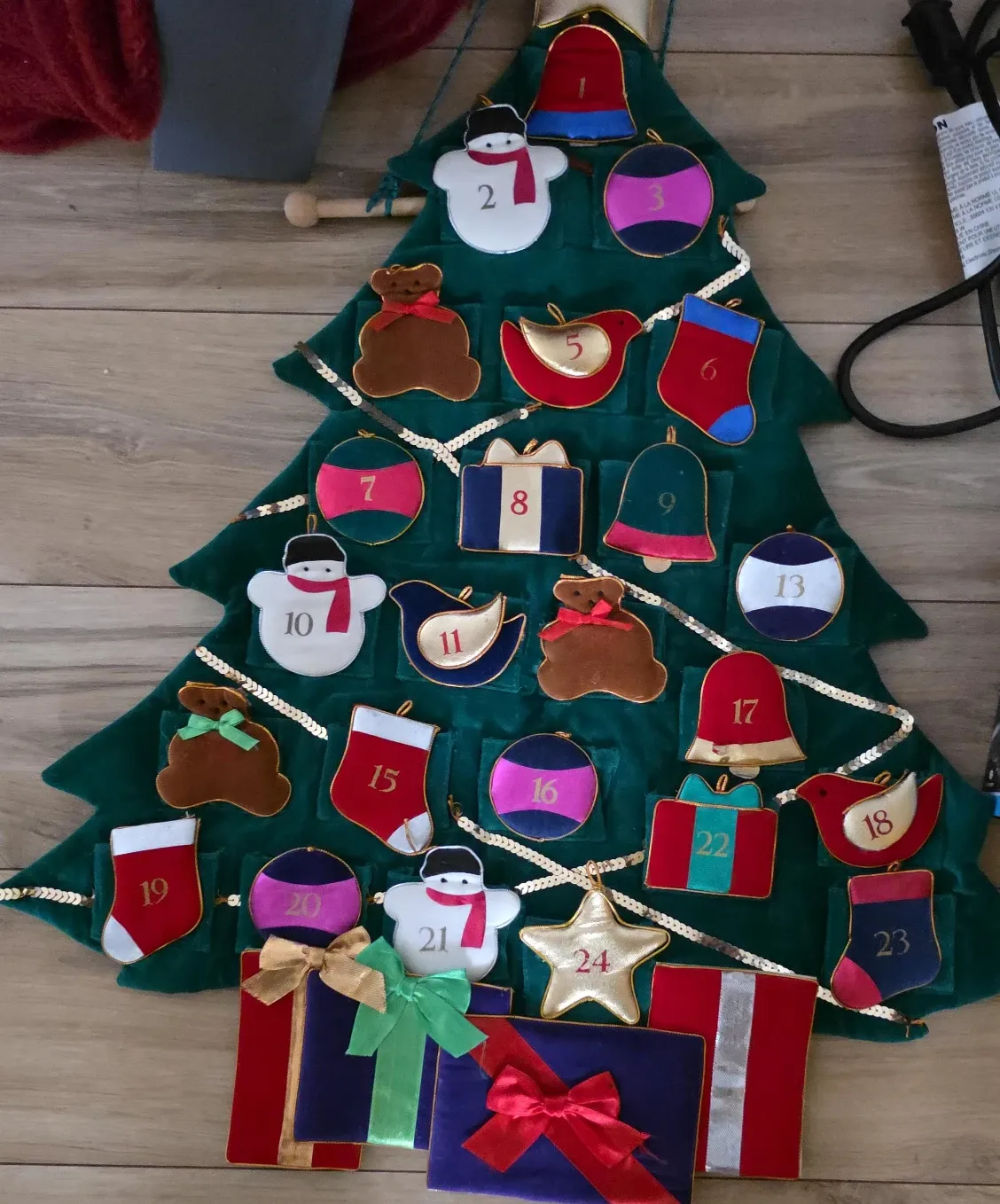 Here's a cute Christmas tree advent calendar! It's in great shape and ready to bring some holiday cheer to your home. Each pocket is numbered for the days leading up to Christmas, perfect for small treats or toys