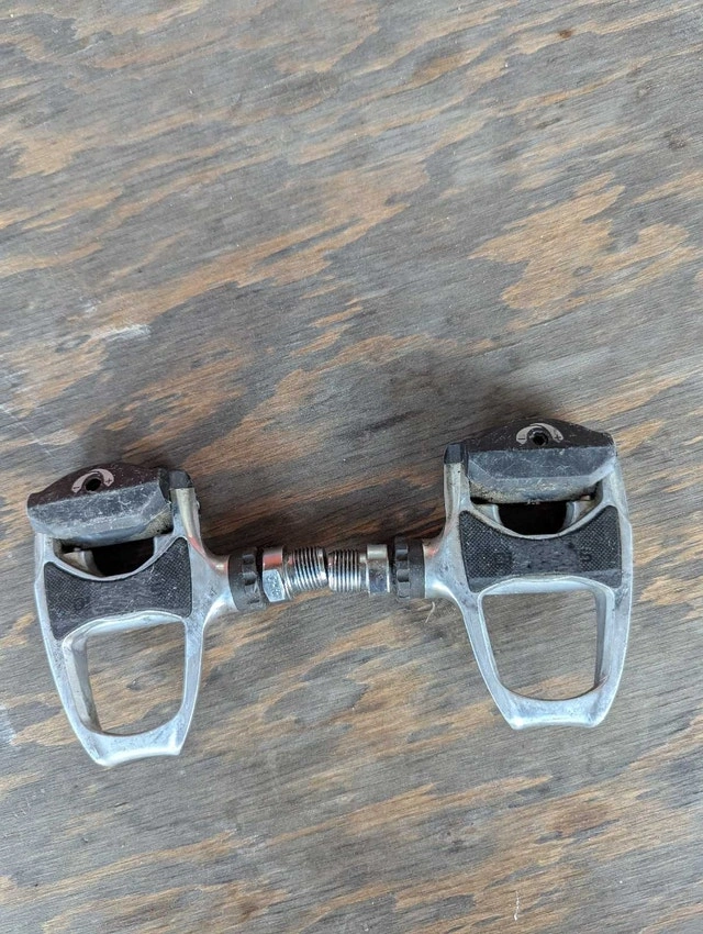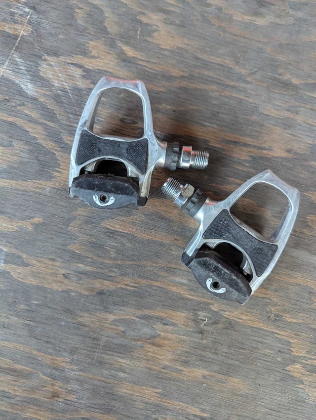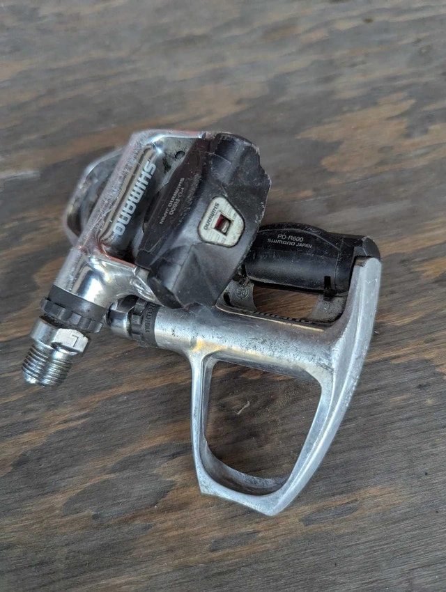 The Shimano PD-R600 was a road clipless pedal, often described as an Ultegra-level equivalent to the high-end Dura-Ace 7750 pedal, offering a similar wide, low-profile platform for stability and comfort. It featured an SPD-SL cleat-compatible design with adjustable tension and an easy clip-in action due to the pedals slanting upwards for entry. These pedals were known for their functionality and a slight weight advantage over their Dura-Ace counterparts, though installation required an 8mm Allen key rather than traditional wrench flats.