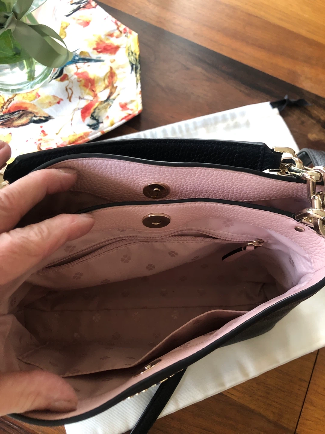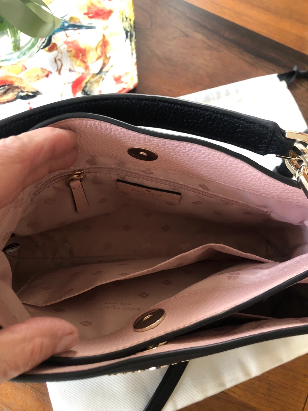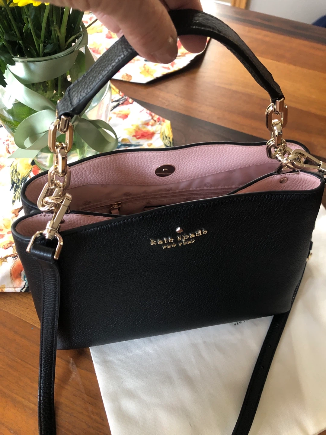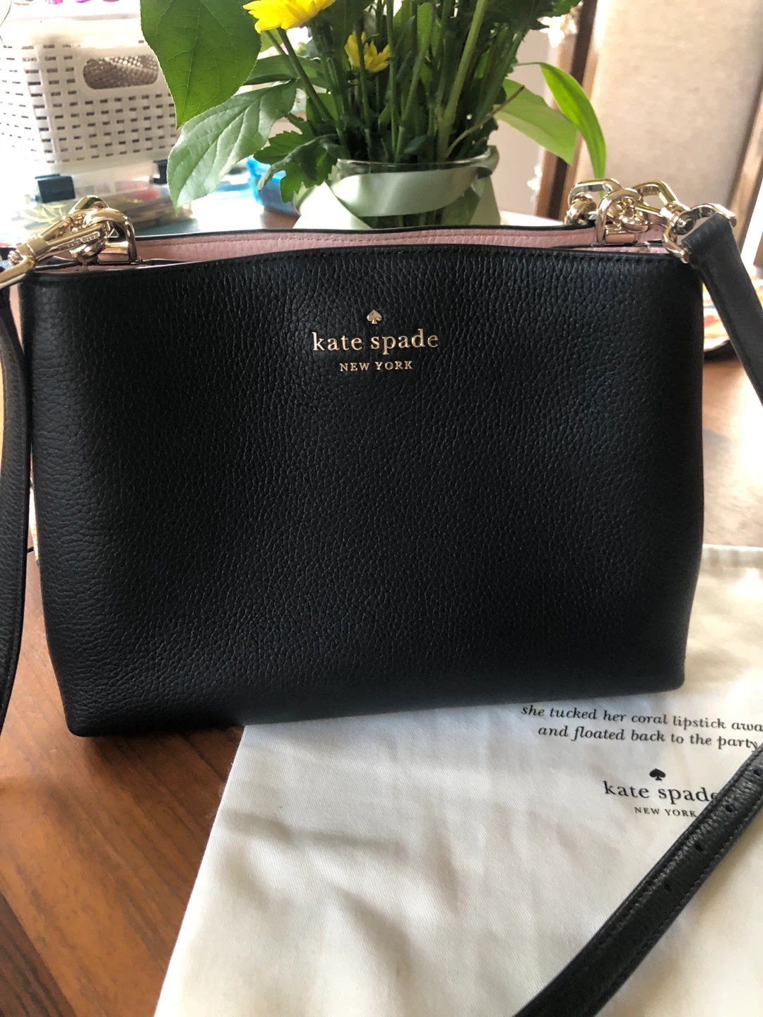 Selling a Kate Spade crossbody bag in black leather. It's in great condition and has a light pink interior. Perfect for everyday use!