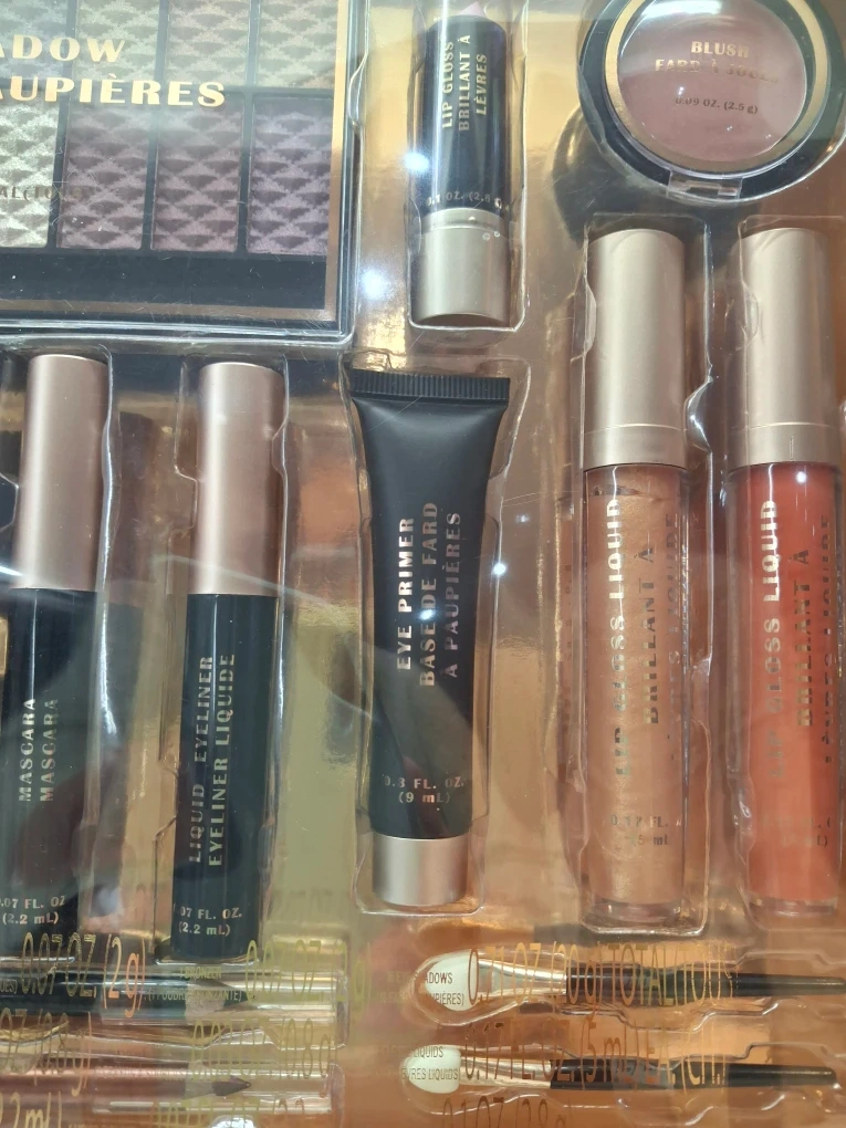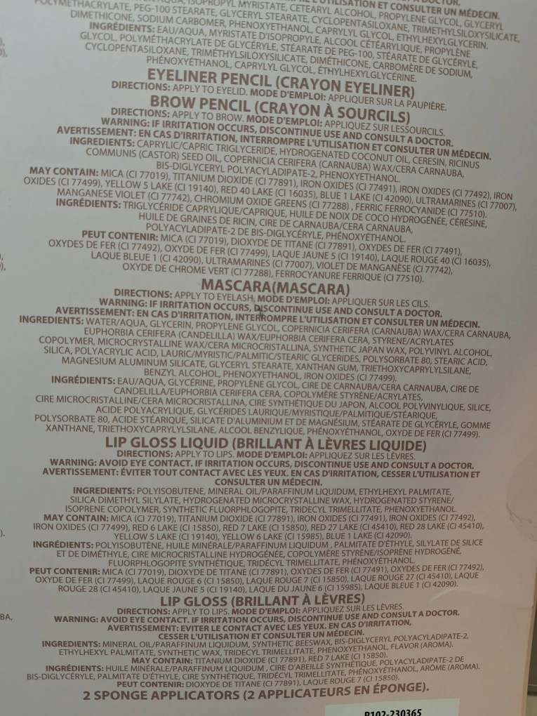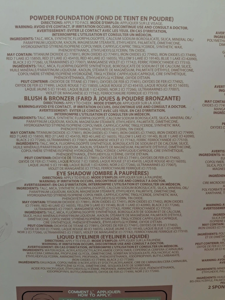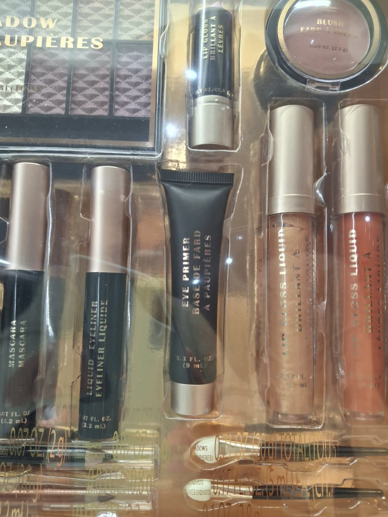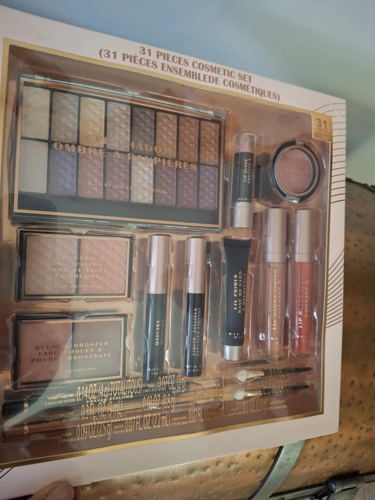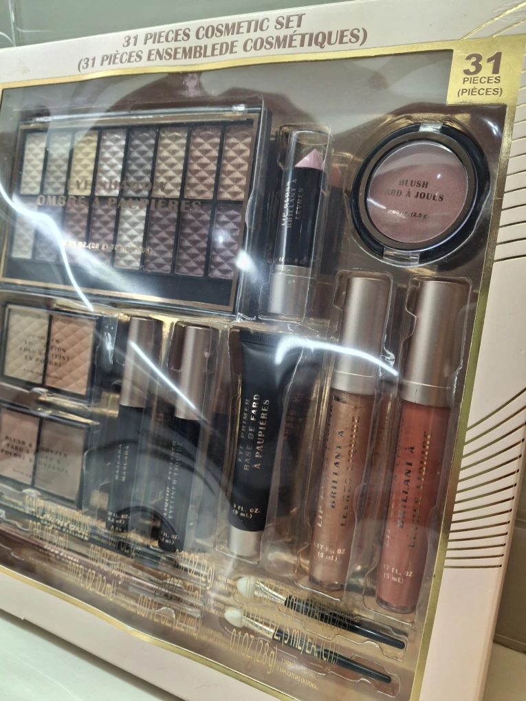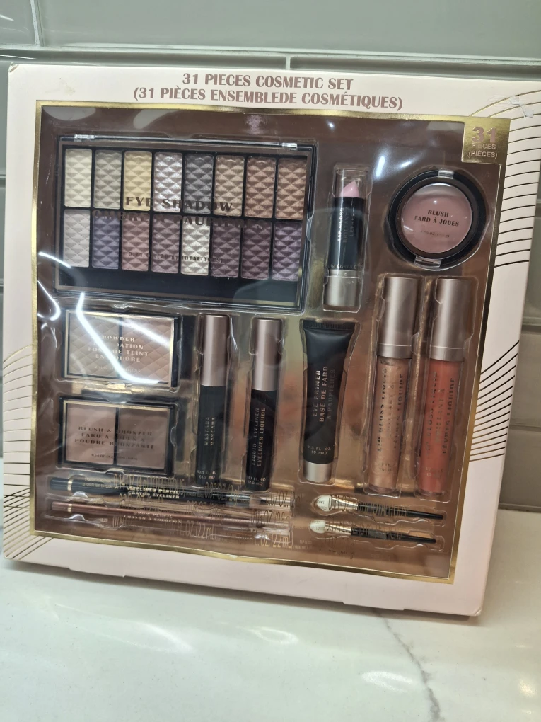 Selling a brand new, 31-piece cosmetic set! It includes eyeshadow, powder foundation, blush, bronzer, mascara, liquid eyeliner, lip gloss, eye primer, and various eyeliner pencils and brushes.