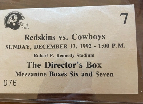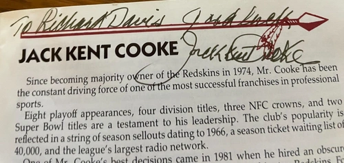 This is an incredible piece for any die-hard Washington Redskins fan. This package includes a 1991 Super Bowl Champions game ticket to Jack Kent Cooke's box, accompanied by a signed press book. The press book highlights the Owner Jack Kent Cooke's successful leadership throughout the season. Display this unique collectible in your home or office to show off your love for the Redskins. Met family in Bahamas and was invited to a game. This is what they gave me. Yes, I sat next to Jack Kent Cooke.