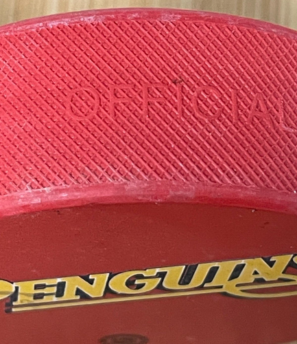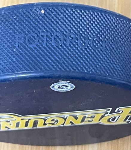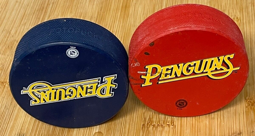 The pucks were used during regular season games at the Civic Arena in Pittsburgh, and feature the name of legendary player Mario Lemieux and the team name of the Penguins. They are great for display or for use in your own hockey game. Let me know if you're interested!