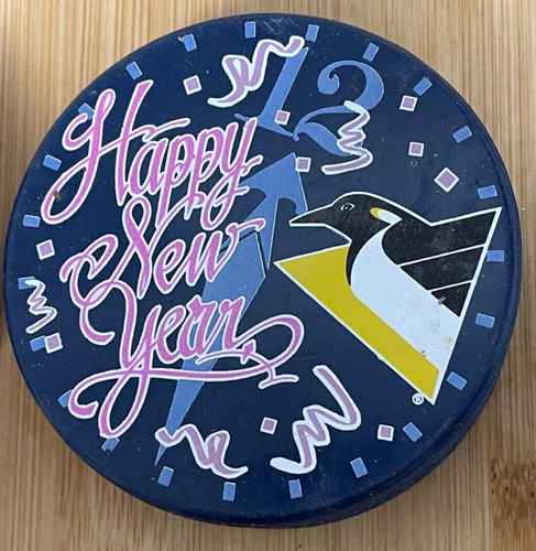 Celebrate the holidays with this special lot of (2) two official NHL pucks featuring the Pittsburgh Penguins! Each puck is decorated in festive colors and designs, with one featuring a HAPPY HOLIDAY's theme and the other a NEW YEAR's theme. These regulation size pucks are made by FOTOPUCK in Canada and are officially licensed by the National Hockey League. They are perfect for any fan of the sport or collector of hockey memorabilia.