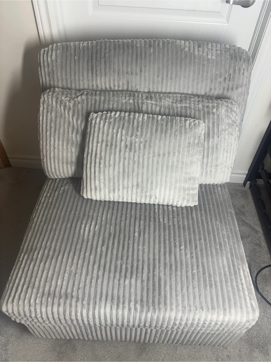 Selling a comfy grey corduroy armchair! It's in great shape and would be perfect for a reading nook or extra seating in your living room. The corduroy texture adds a cozy touch to any space. Available for pickup and delivery