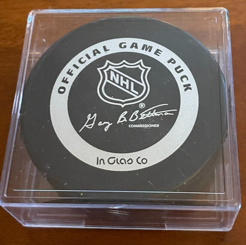 This vintage Pittsburgh Penguins NHL game puck from the 1980s is a must-have for any hockey fan. It features the InGlasCo Bettman silver logo and is an original autograph, making it a rare find. With a focus on Mario Lemieux, this piece of sports memorabilia is perfect for collectors or fans of the Pittsburgh Penguins team. The puck was made in Canada and was used in the CIVIC ARENA PITTSBURGH during a National Hockey League Game. It is a great addition to any collection and is sure to be a conversation starter. RARE silver logo on back
