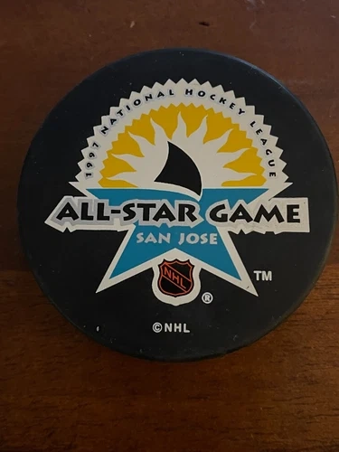 This official licensed 1997 NHL All-Star Game puck comes with an enclosed puck case. The puck features the San Jose Sharks team logo and the event/tournament name "NHL All-Star Game". It is a great addition to any hockey fan's collection. The puck is made by Inglasco, a trusted brand in sports memorabilia, and is officially licensed by the NHL.