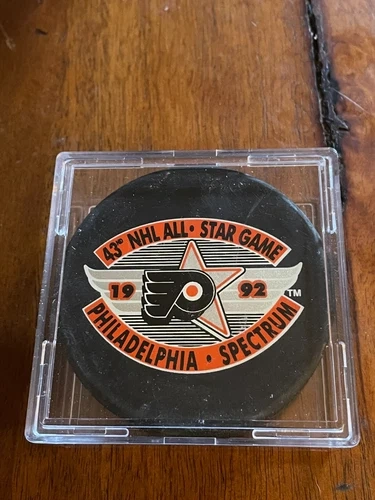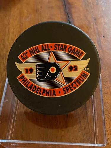 This hockey puck is a great addition to any fan's memorabilia collection. Celebrating the 1992 43rd NHL All-Star Game held at the Philadelphia Spectrum, the game featured the NHL's best including legendary player Mario Lemieux and the logo of the Philadelphia Flyers.