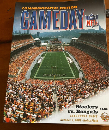 This is a rare and valuable football program from the inaugural game at Heinz Field in Pittsburgh between the Steelers and the Bengals. It is an original and officially licensed piece of vintage sports memorabilia, perfect for avid NFL fans and collectors alike. The program is in mint condition and features detailed information about the event and both teams, including player rosters and statistics.
