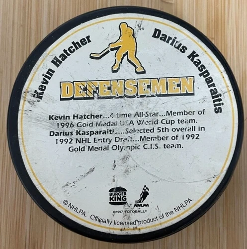 This official NHL hockey puck is a must-have for fans of the Pittsburgh Penguins. Featuring the iconic team logo and colors, this regulation-sized puck is perfect for display or use on the ice. The puck commemorates the Civic Arena in Pittsburgh and is officially licensed by the NHL and Burger King. It features the names of Mario Lemieux, Hatcher, and Kasparaitus.