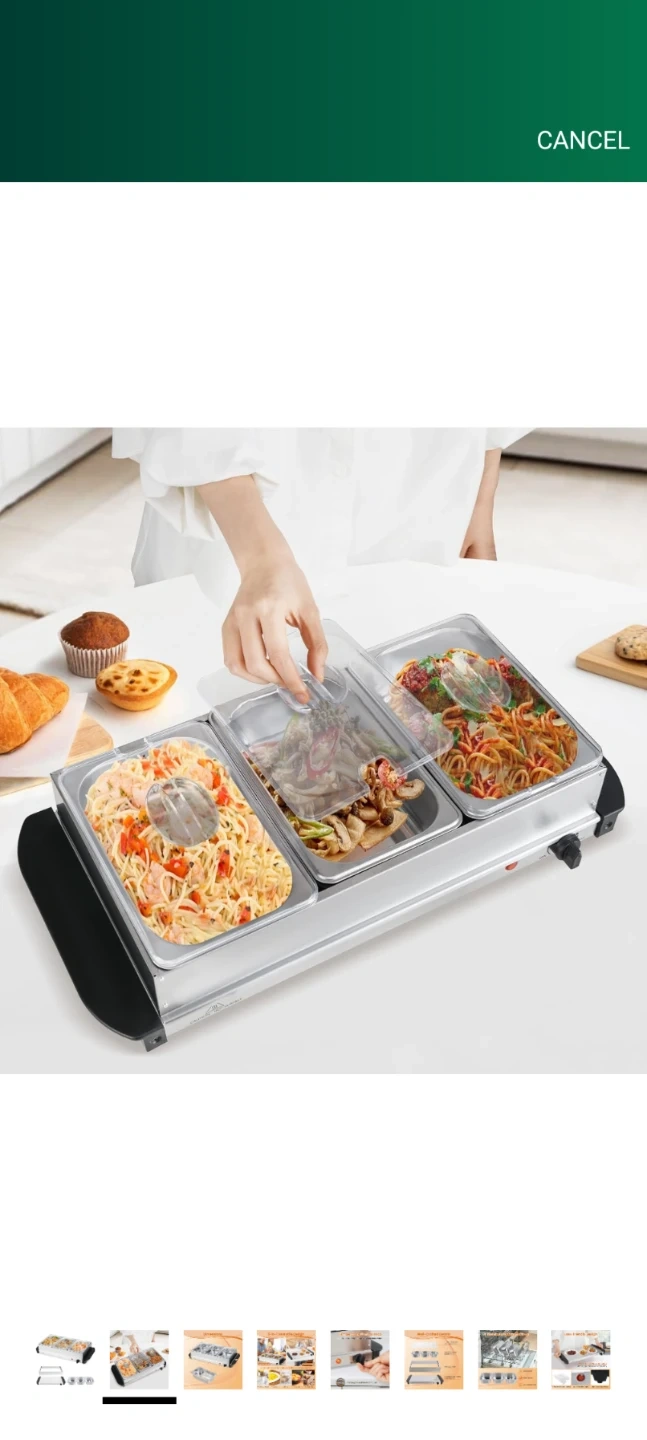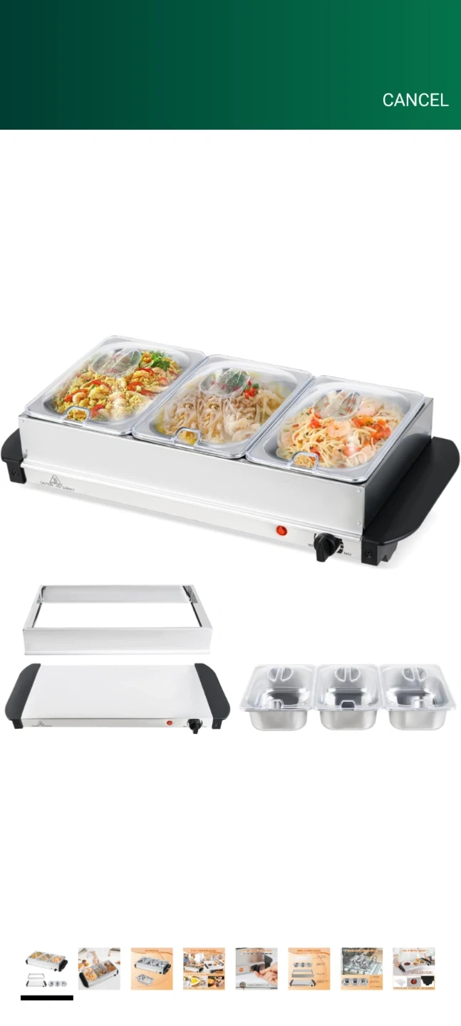 Keep your food warm and ready to serve with this buffet server! It features three stainless steel buffet trays with transparent lids that have utensil slots. The dimensions are 21" x 10" x 6".
