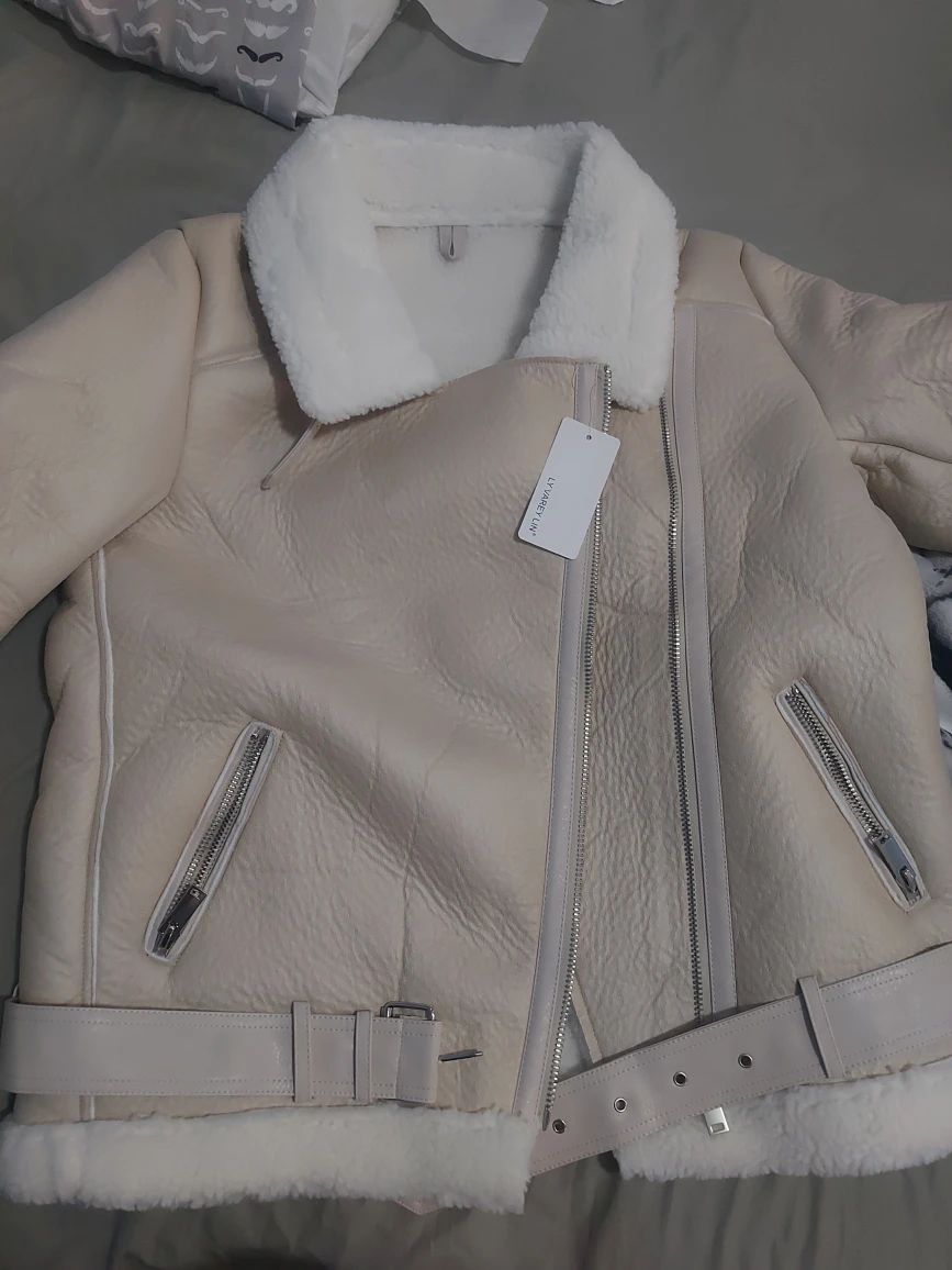 Snuggle up in this cozy faux shearling moto jacket from LY VAREY LIN! It's a winter shearling coat with a thick lining, perfect for those chilly days. The beige colour is super versatile and will match everything in your wardrobe! Selling it cause I bought the wrong size. Bought it for $60 will sell it fot $50. Size Xl. Super pretty tho.