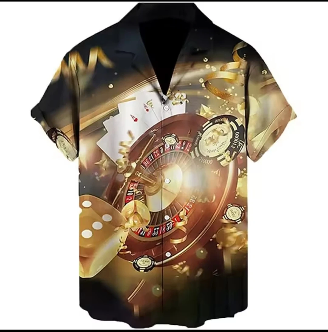 74This short-sleeve shirt features a fun casino print, perfect for a casual and unique look! The design includes a roulette wheel, playing cards, and dice. It's a great conversation starter!