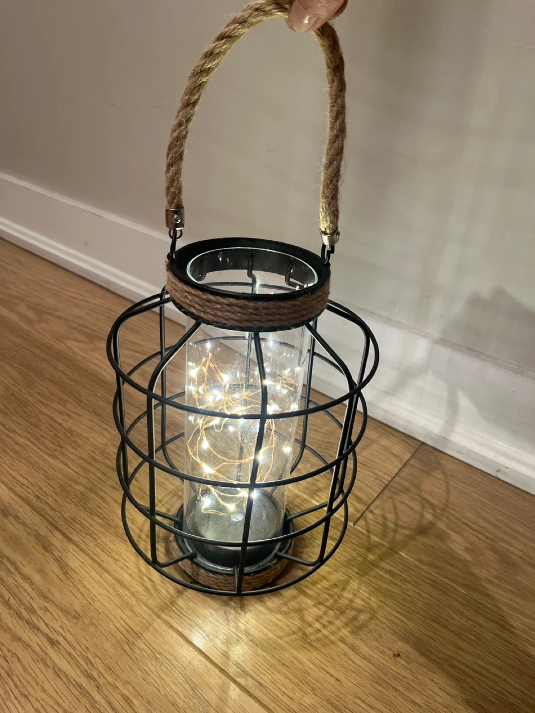 Selling a decorative metal lantern with string lights inside. It has a rustic look with a rope handle, perfect for adding a cozy touch to any room. The lights give off a warm glow, creating a relaxing atmosphere