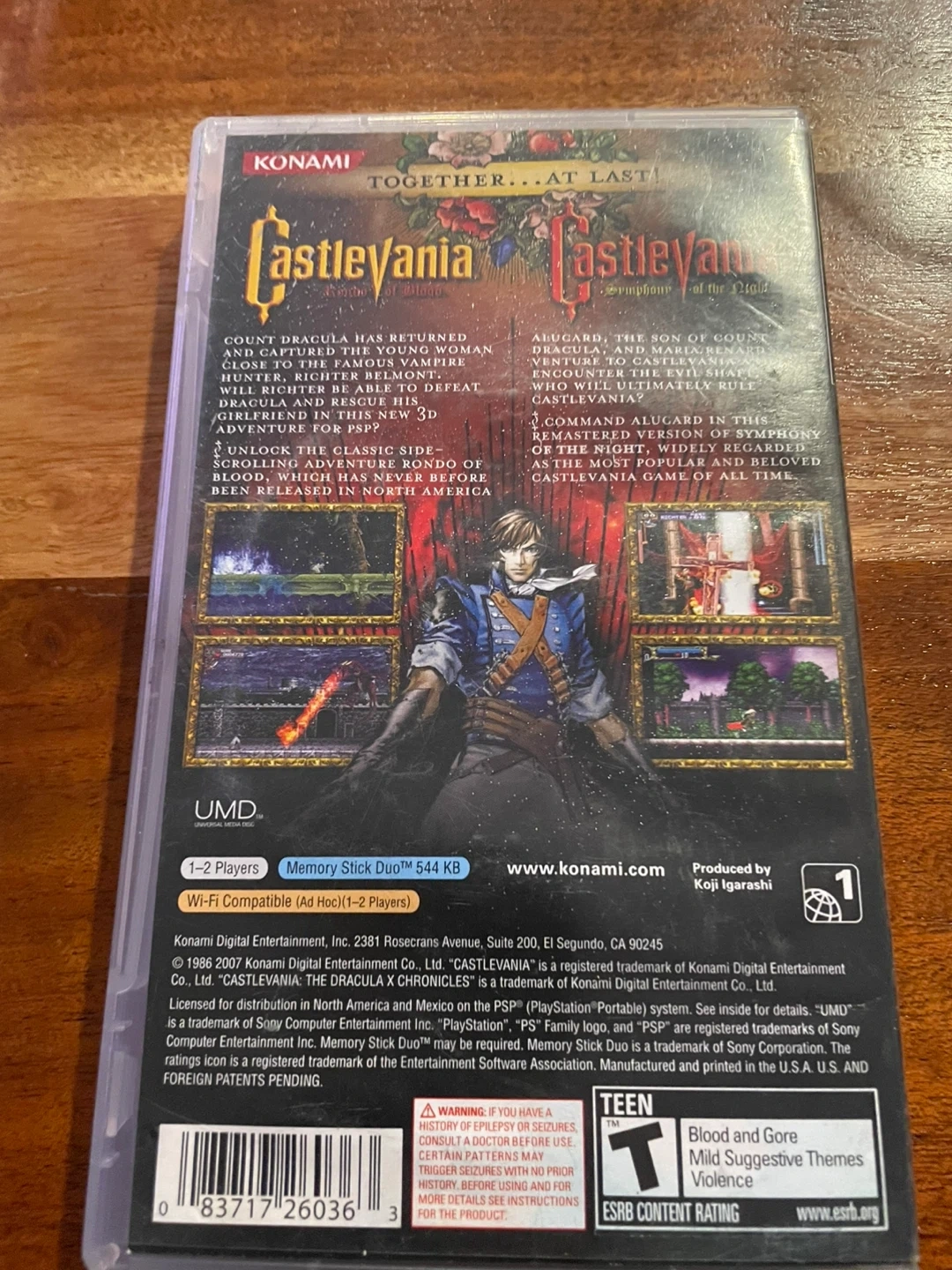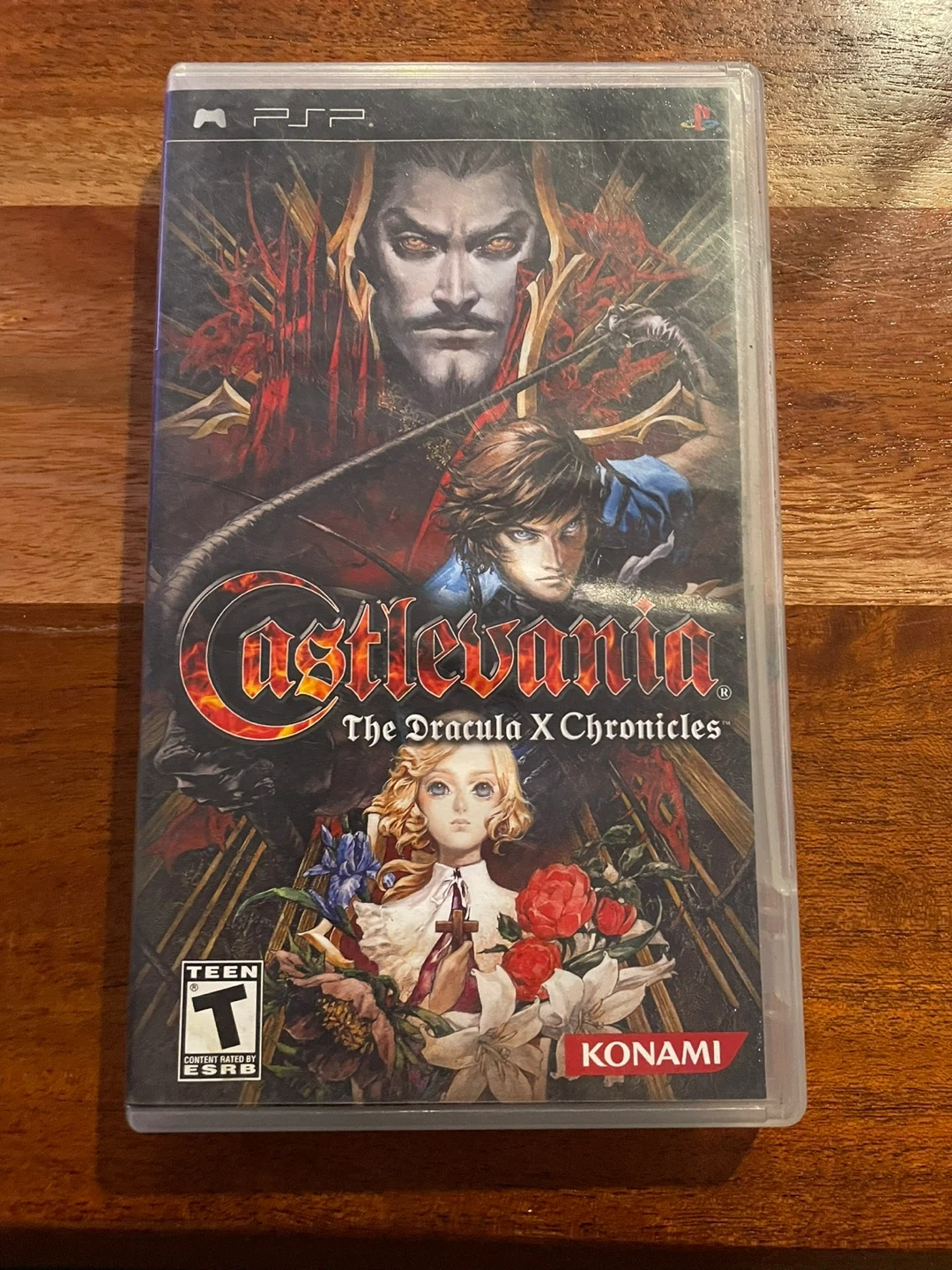This is the Castlevania The Dracula X Chronicles game for PSP. It includes the original case and UMD disc. This action-adventure game lets you play as Alucard, the son of Dracula, or Richter Belmont.