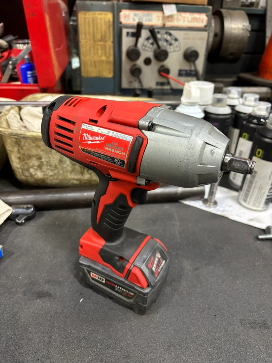 Milwaukee M18 1/2 inch cordless impact wrench with a Red Lithium XC 3.0 battery included. It's a tool for automotive or mechanical tasks.