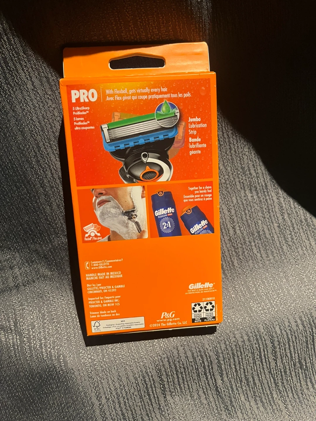 Selling a Gillette Fusion5 ProGlide razor with two cartridges. The box highlights that it has Flexball technology to get virtually every hair. It also has a jumbo lubrication strip, so it's sure to be a smooth shave