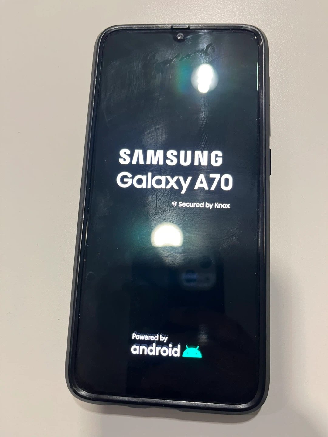 This is a black Samsung Galaxy A70 smartphone. It features a triple rear camera system. Comes with a Spigen case with kickstand. 128GB STORAGE UNLOCKED NO CRACKS pick up downtown Toronto cash only on pick up thank you