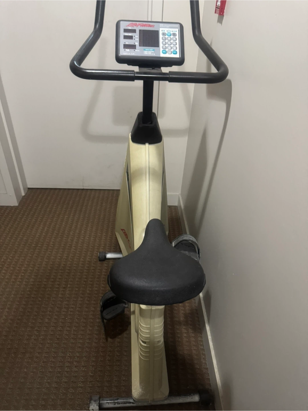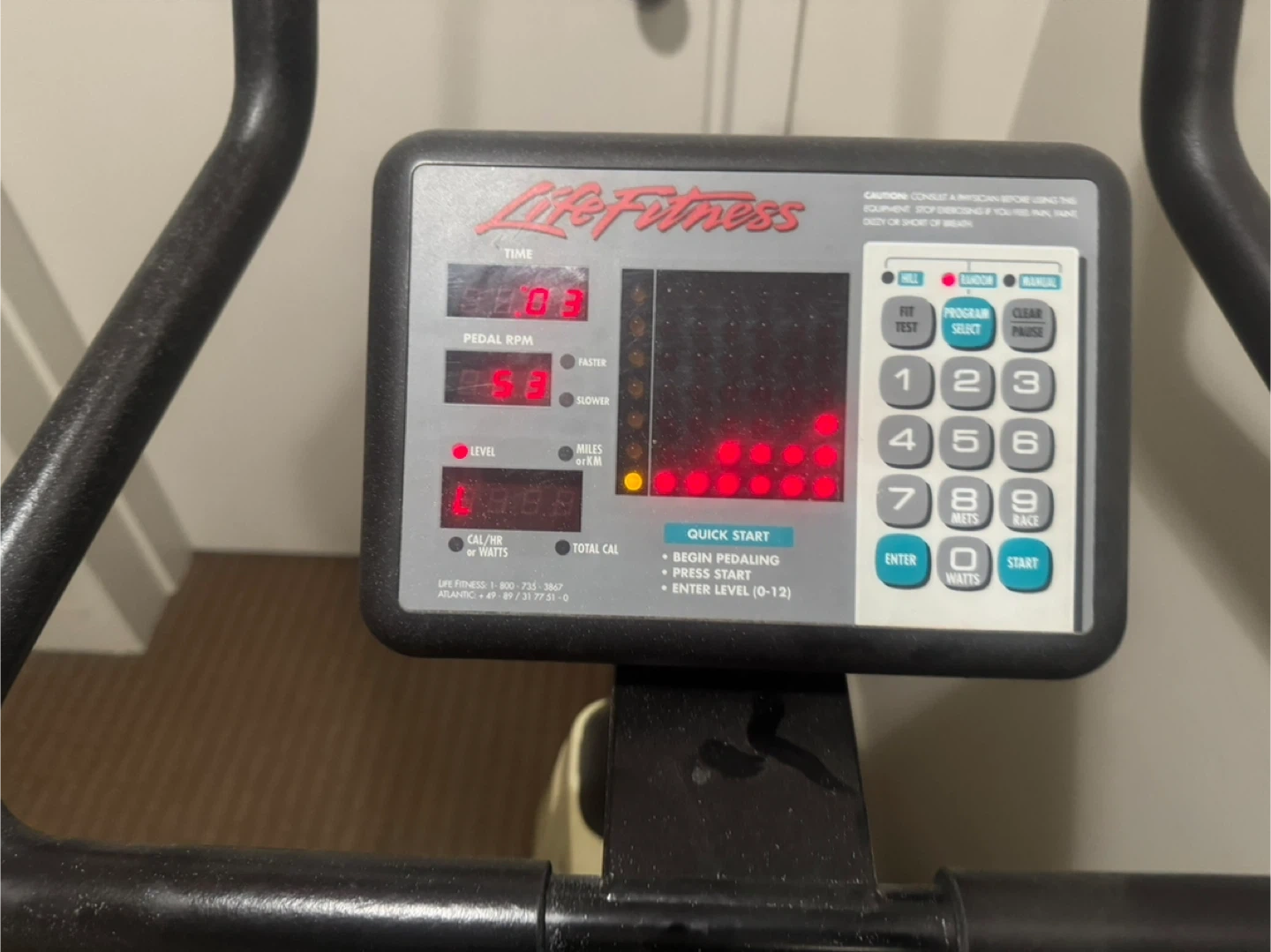 This is a Life Fitness 4500 stationary exercise bike. It includes a digital display showing time, RPM, level, and total calories. The bike has adjustable resistance levels.