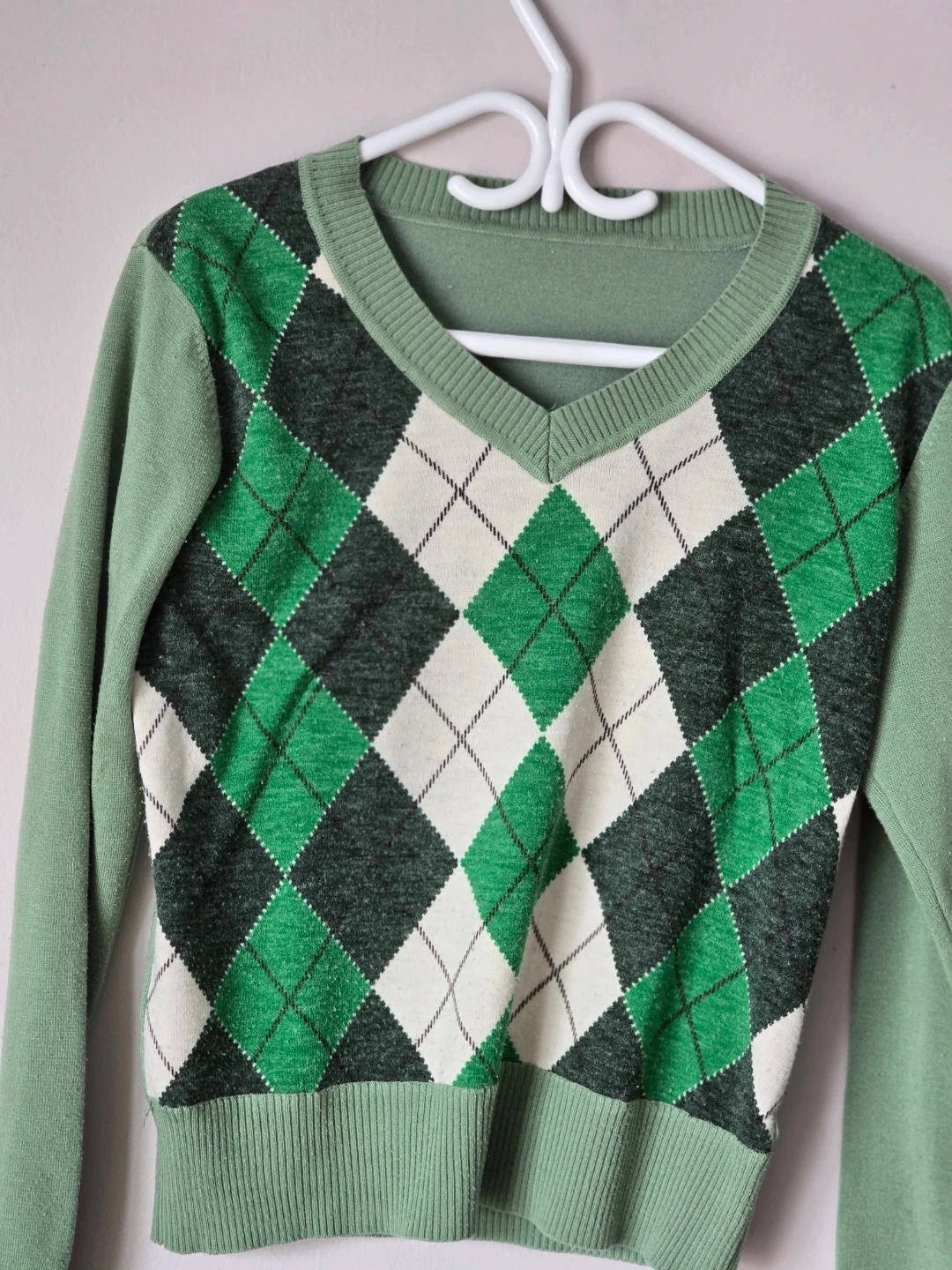 This is a green v-neck sweater featuring an argyle pattern on the front. It has long sleeves and a ribbed hem. 100% acrylic material.