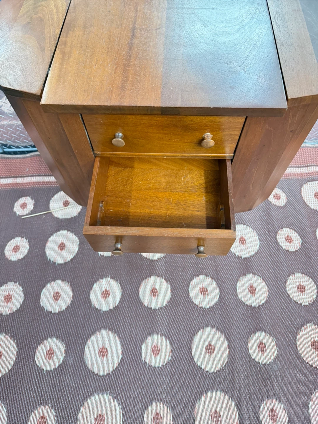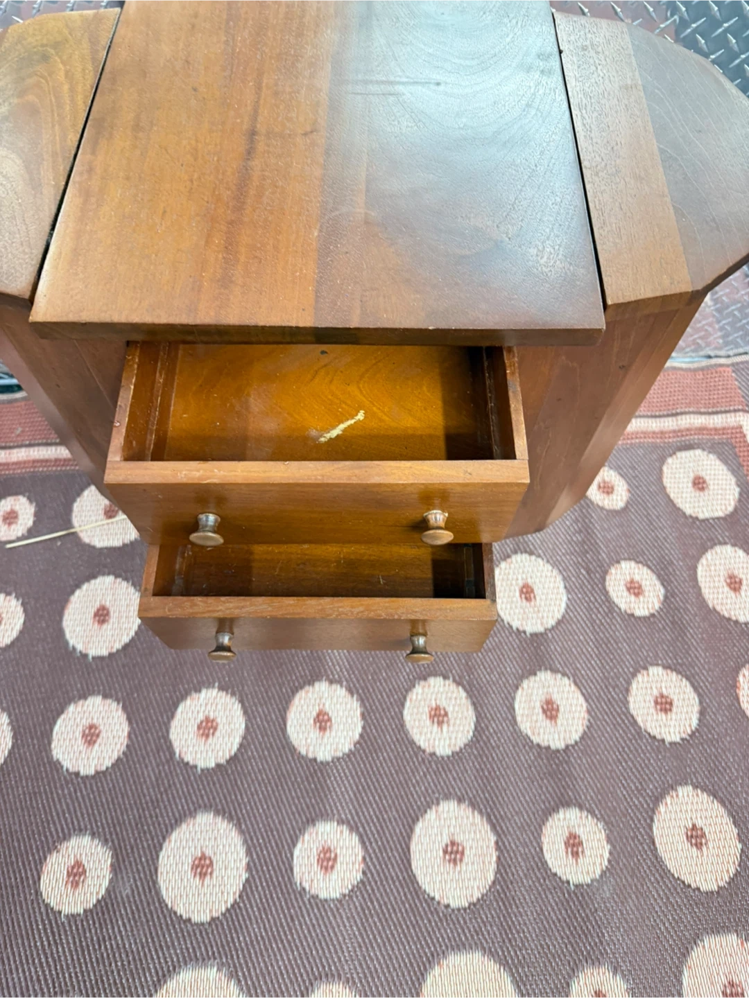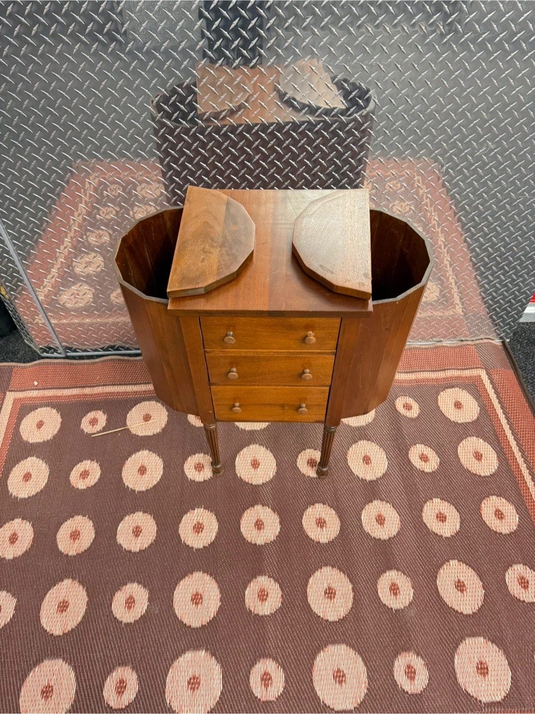 This is a wooden sewing basket with a table top. It features three drawers and two compartments that open from the top. The wood has a warm, natural finish. This piece is perfect for storing sewing supplies or other small items!