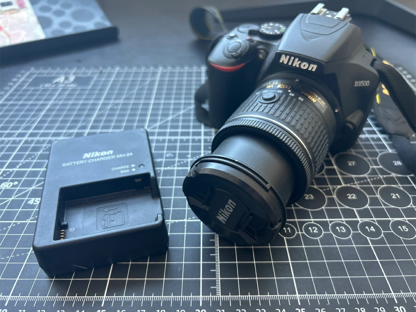 This is a Nikon D3500 DSLR camera with its original battery charger. It's a great camera for beginners and enthusiasts alike. The charger is a Nikon MH-24 model.