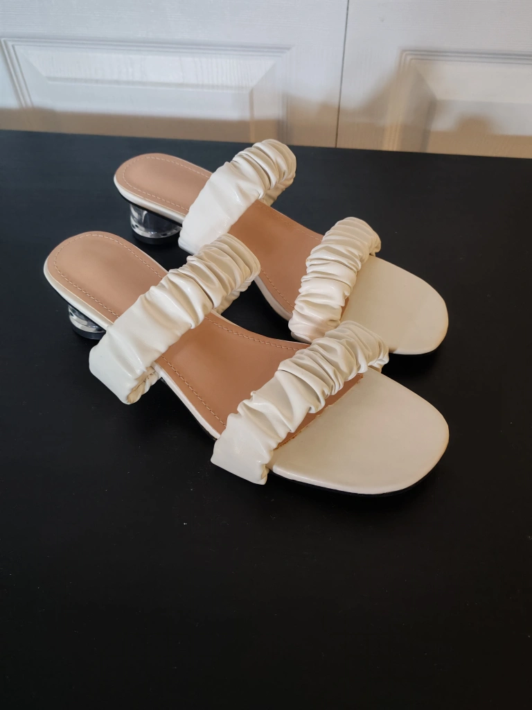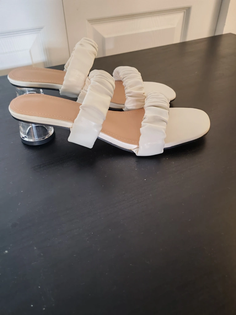 These stylish white sandals feature a comfortable block heel and trendy ruched straps across the vamp. The open-toe design and light tan footbed make them perfect for warmer weather. Heel height appears to be around 2 inches. Size EU 40 (US9)