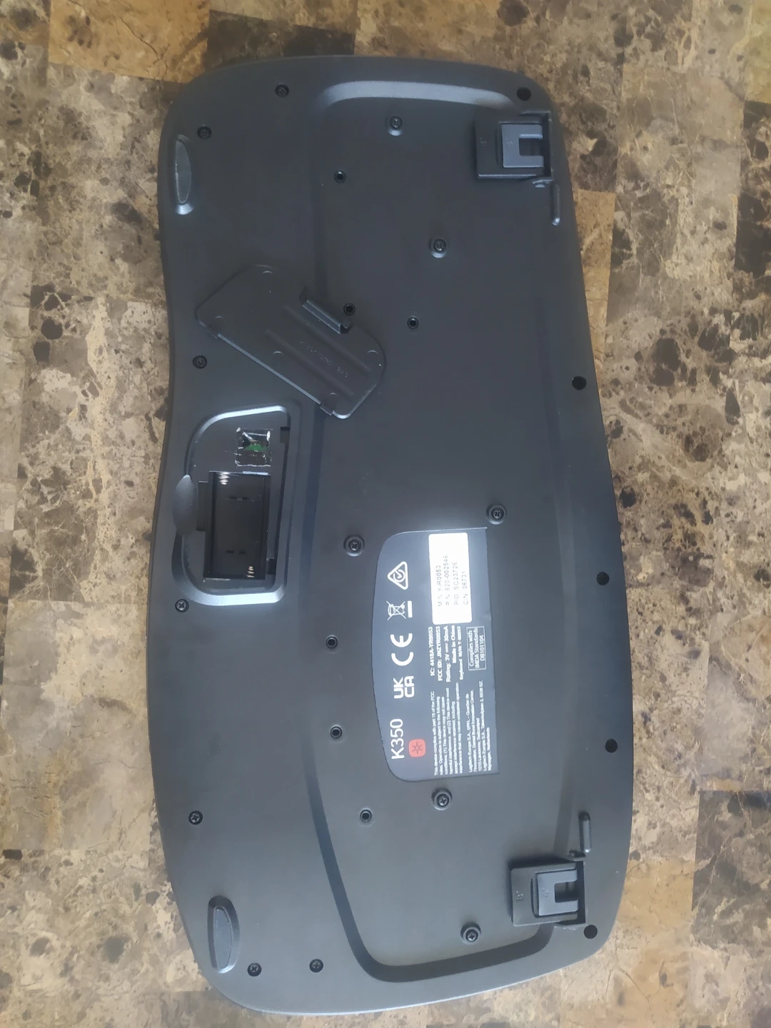 This is a black Logitech K350 wireless ergonomic keyboard. It's designed for comfortable typing with a sculpted shape. Includes a USB receiver.But it isn't in a working condition.