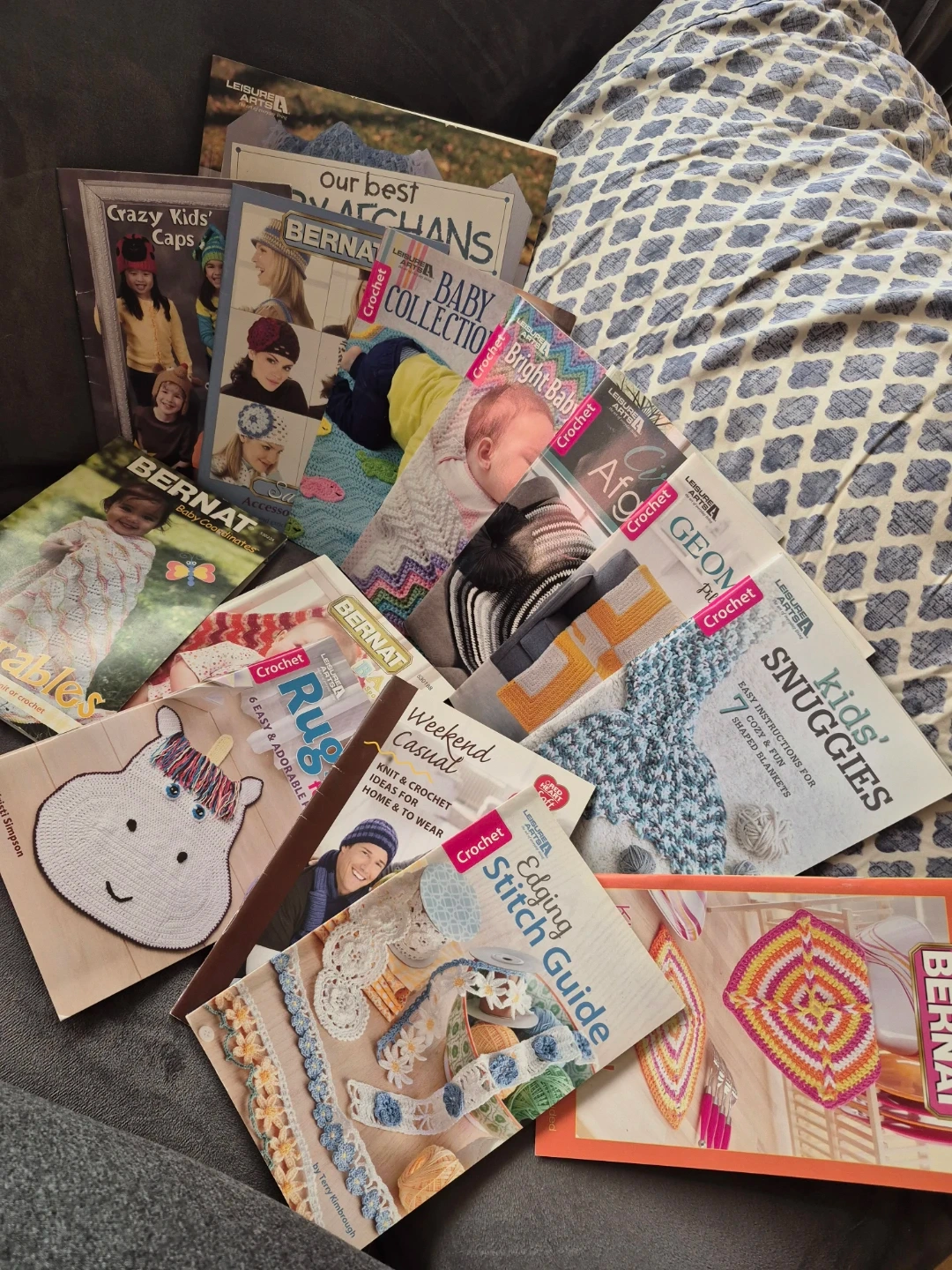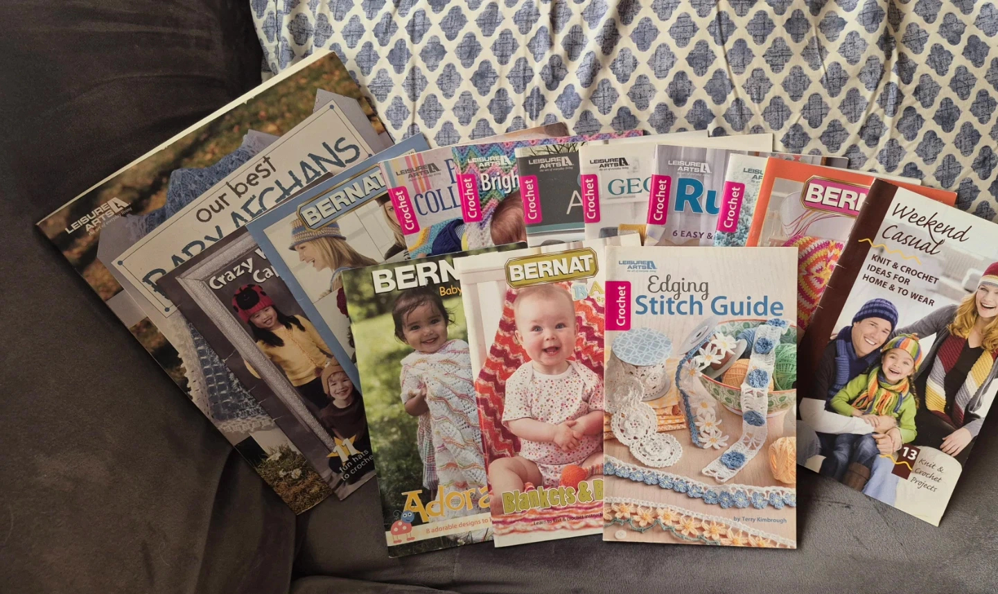 This bundle includes a variety of crochet and knit pattern books from Bernat and Leisure Arts. It features titles like "Our best Afghans," "Crazy Kids Caps," "Baby Collection," "Bright Baby," "Edging Stitch Guide," "Weekend Casual," and more. Pattern books for blankets, hats, and home decor are included. These books are great for crafters looking for new knitting and crochet projects.