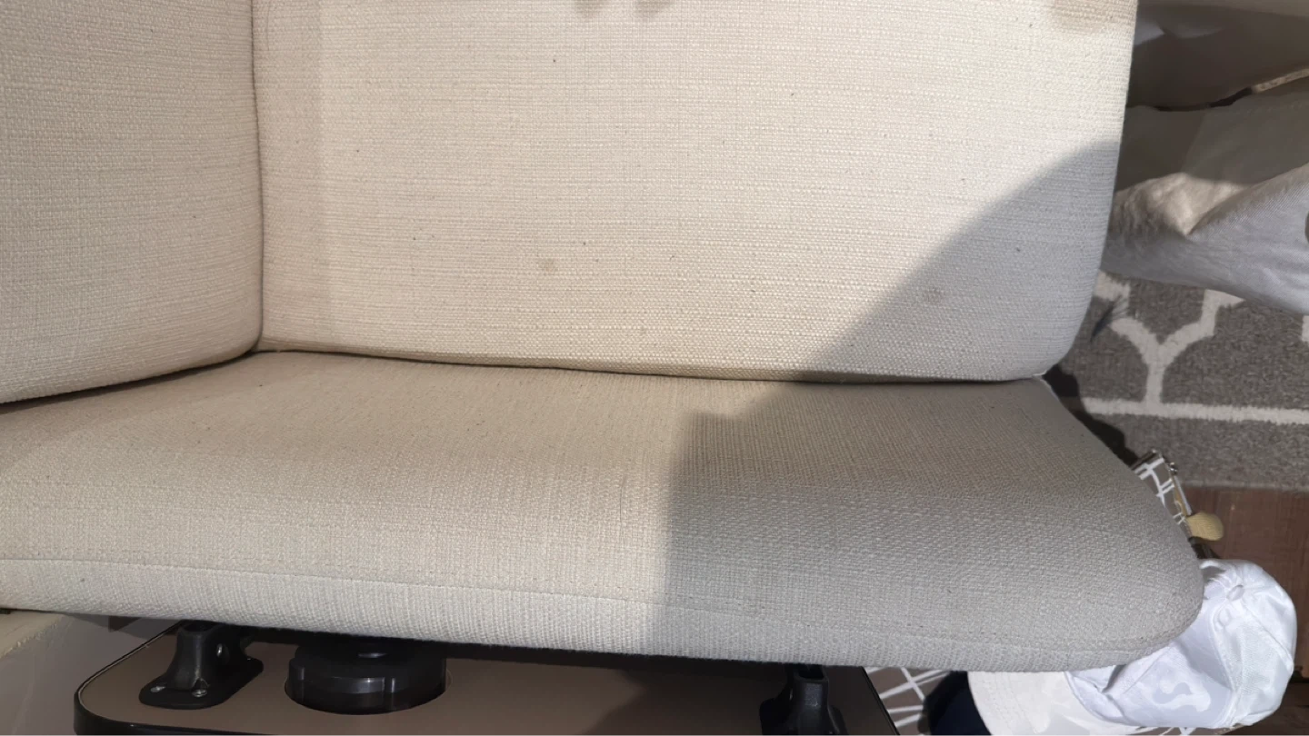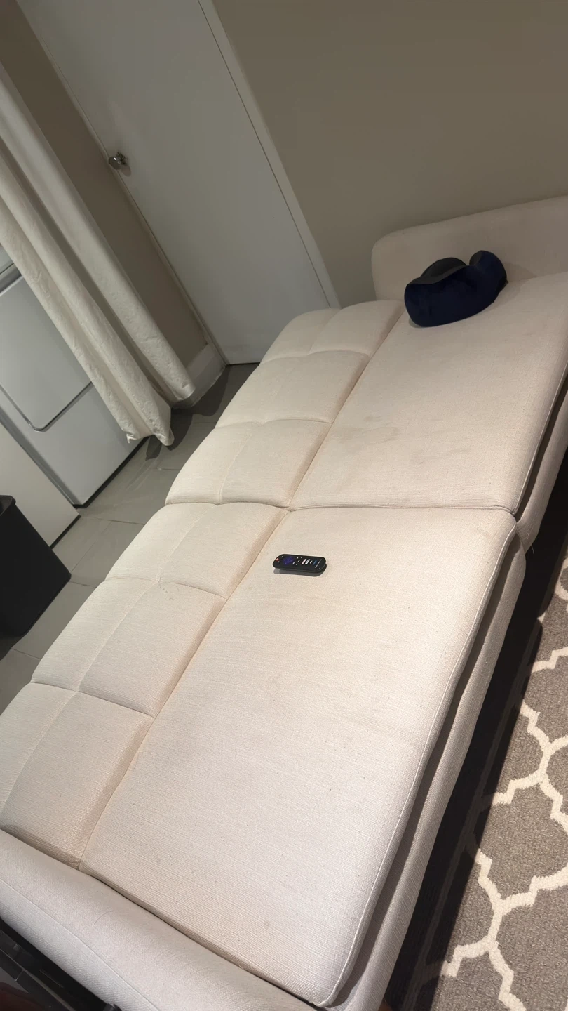 Cream coloured futon sofa with a linen-like fabric. It easily converts from a sofa to a bed. Fabric material with wood legs.