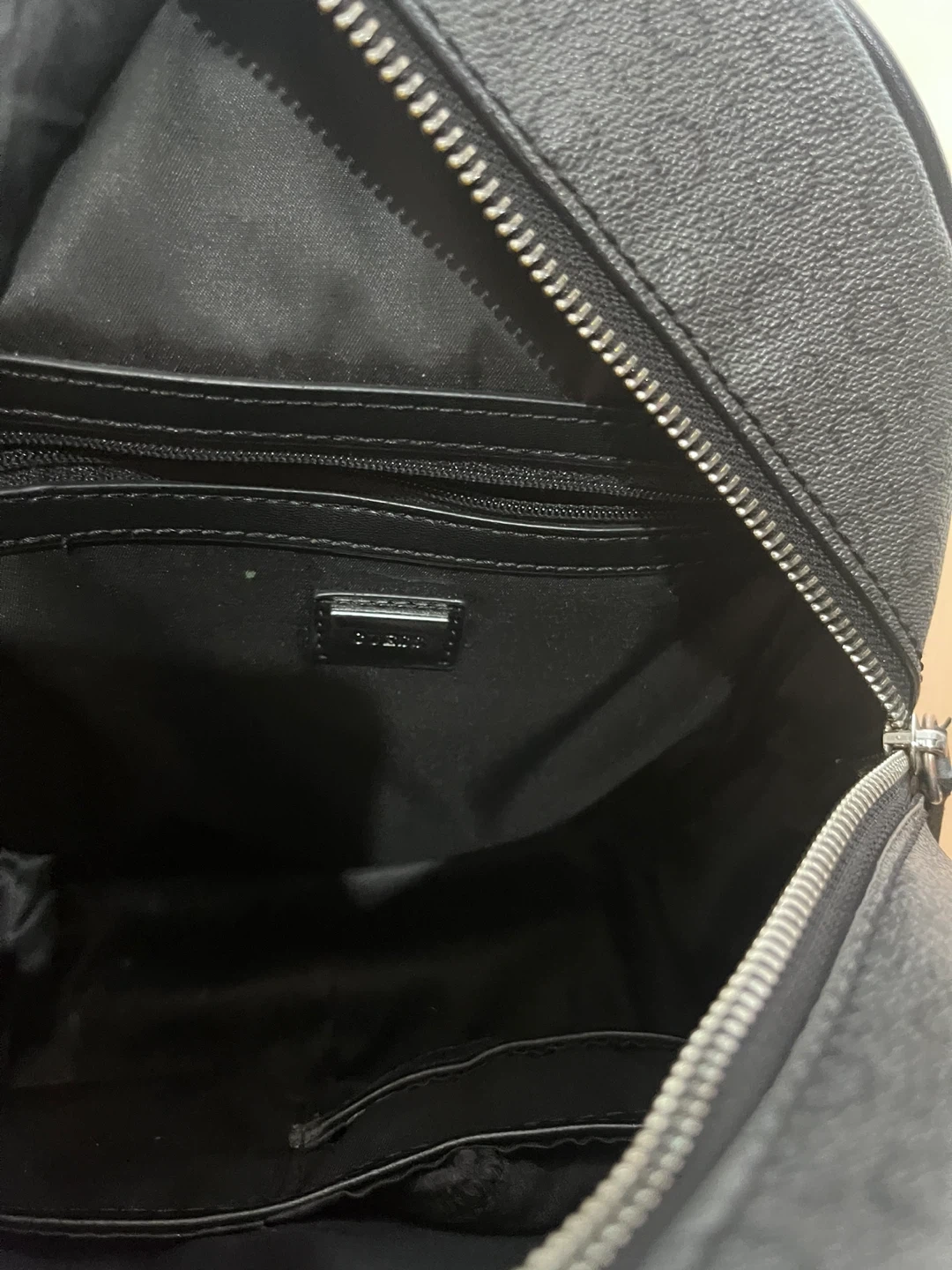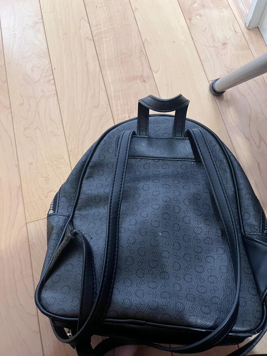 This is a stylish GUESS black backpack. It features a front pocket with a decorative silver chain. The interior is black and includes multiple compartments for organization. It's a great accessory for everyday use!