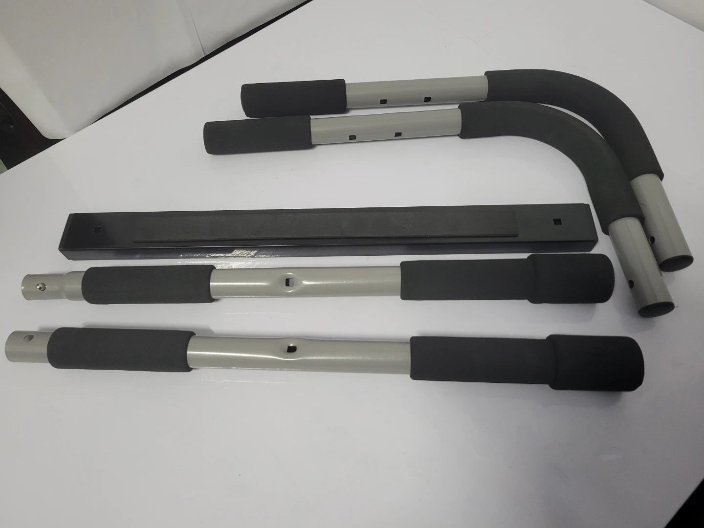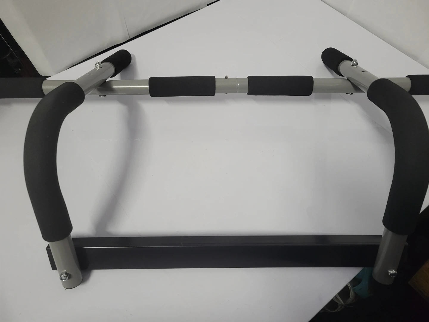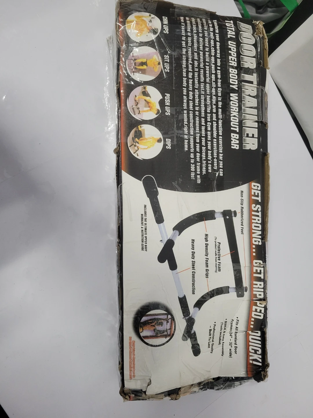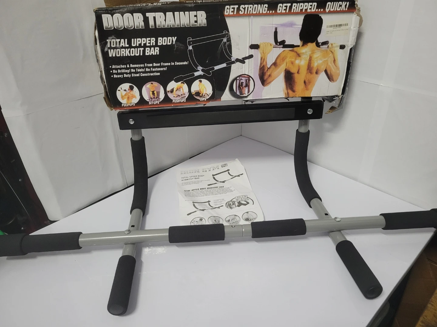 This is the Iron Gym Total Upper Body Workout Bar. It attaches and removes from door frames in seconds, no drilling or tools needed. Heavy duty steel construction with foam grips. The bar is new but the bix is in poor condition.