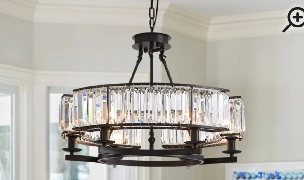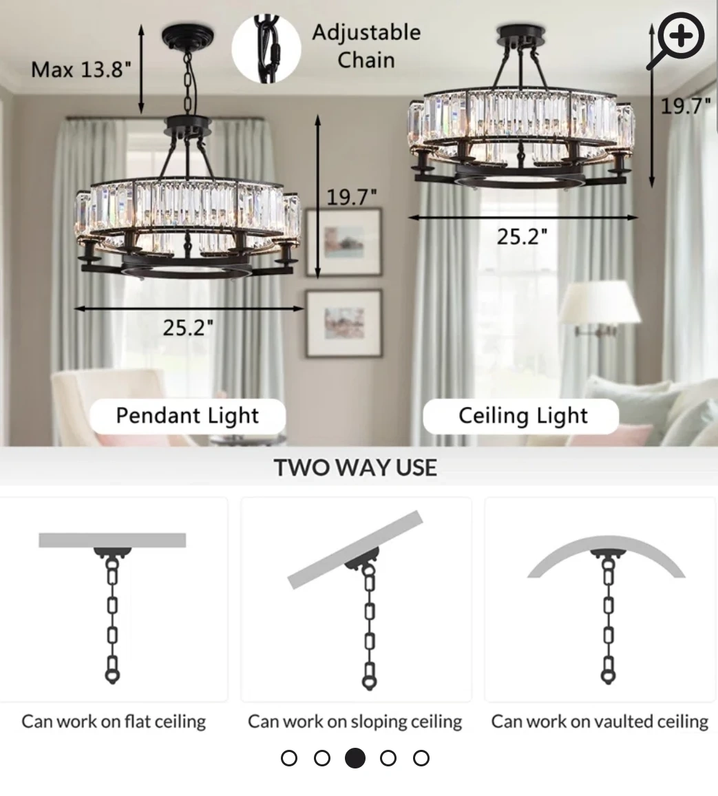 Black crystal chandelier with adjustable chain. Works on flat, sloping, and vaulted ceilings. Comes with all mounting hardware. Bulbs not included